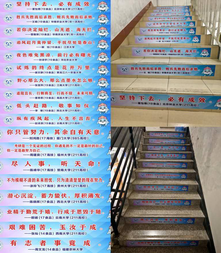 海洋与食品学院的“星光阶梯”以独树一帜的设计将空间转化为育人载体,成为学子逐梦路上的“能量补给站”。台阶上印有考研学长学姐的励志箴言与院校专业信息,辅以“政策领航”“专业赋能”两大主题板块,让“爱拼敢赢·逐梦深蓝”的学院精神随每一步向上延伸,成为激励学子向学术与职业梦想的坚实阶梯。
