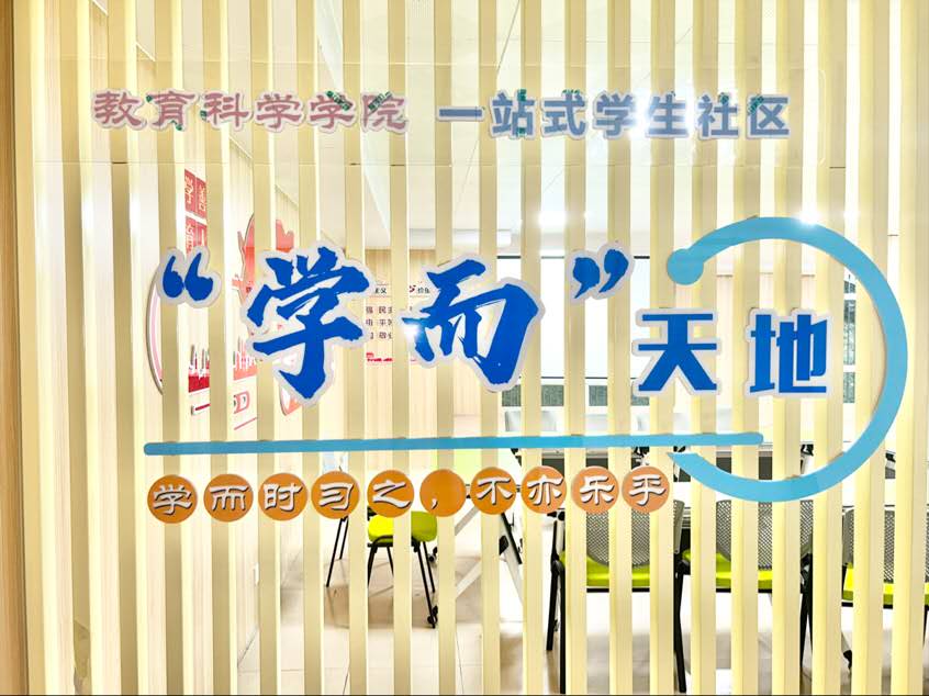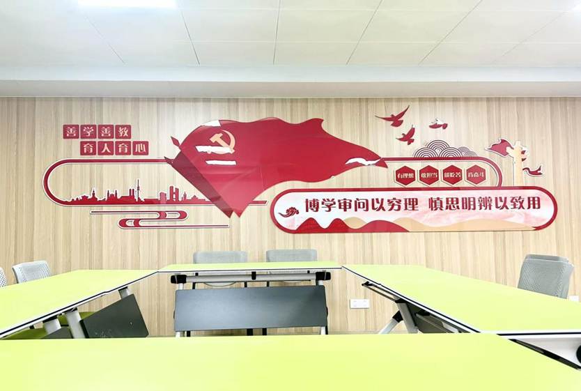 教育科学学院紧扣师范专业属性,匠心营造楼栋空间,打造成为赋能师范生素养培育的“立体课堂”。空间围绕“善学善教”主题,结合《礼记》治学格言与对新时代青年教师的素养要求,辅以巨幅党旗、党徽、飞鸟与祥云等元素,突出党建在育人工作中的核心引领作用,也让“育人育心”的师范教育初心融入日常景观。