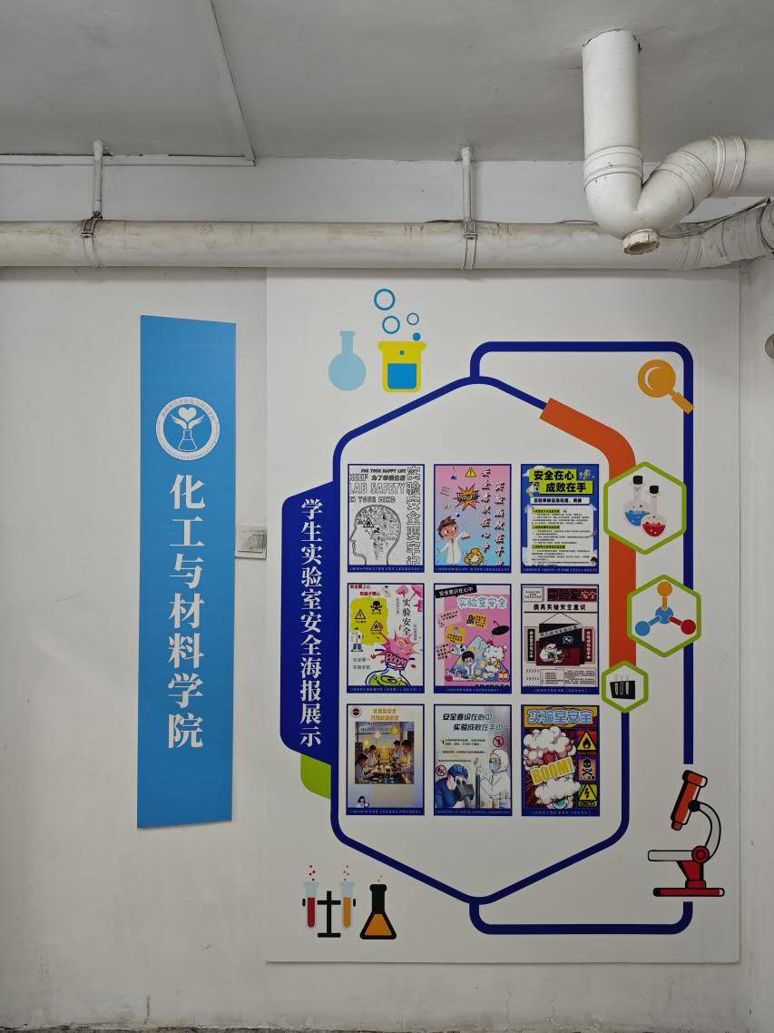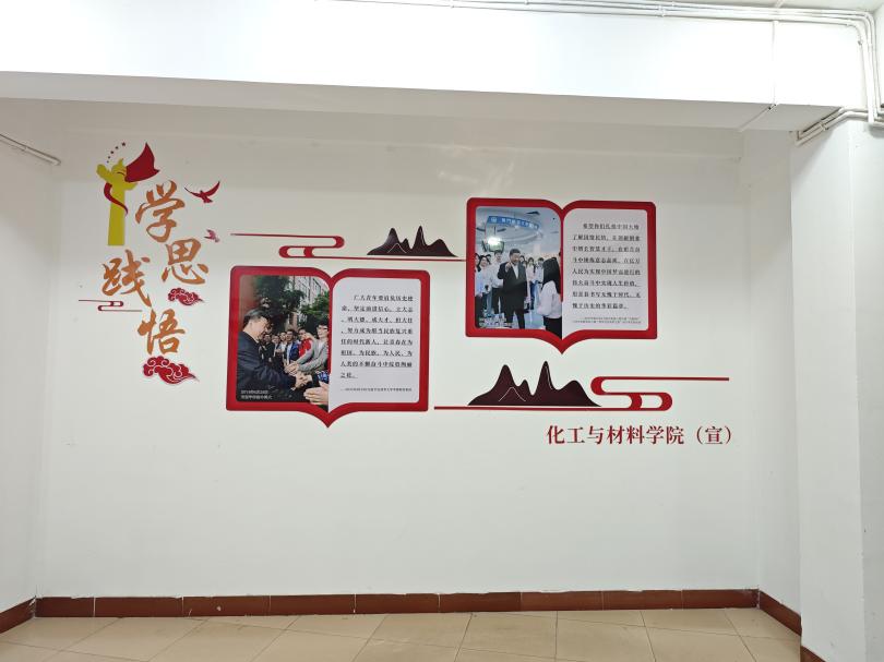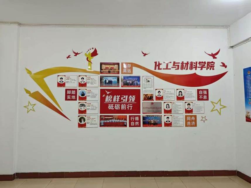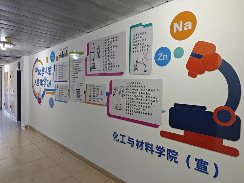 化工与材料学院将专业底蕴与思想引领有机融合,倾力打造出的文化墙既是视觉名片,更是精神阵地。文化墙以红色为主色调,融合黄色飘带、五角星与飞鸟等元素,突出呈现“脚踏实地”“志存高远”“自强不息”“同舟共济”等精神标语,既呼应化工材料学科严谨务实、深耕细研的专业特质,也高度凝练了学院师生共同的价值追求。