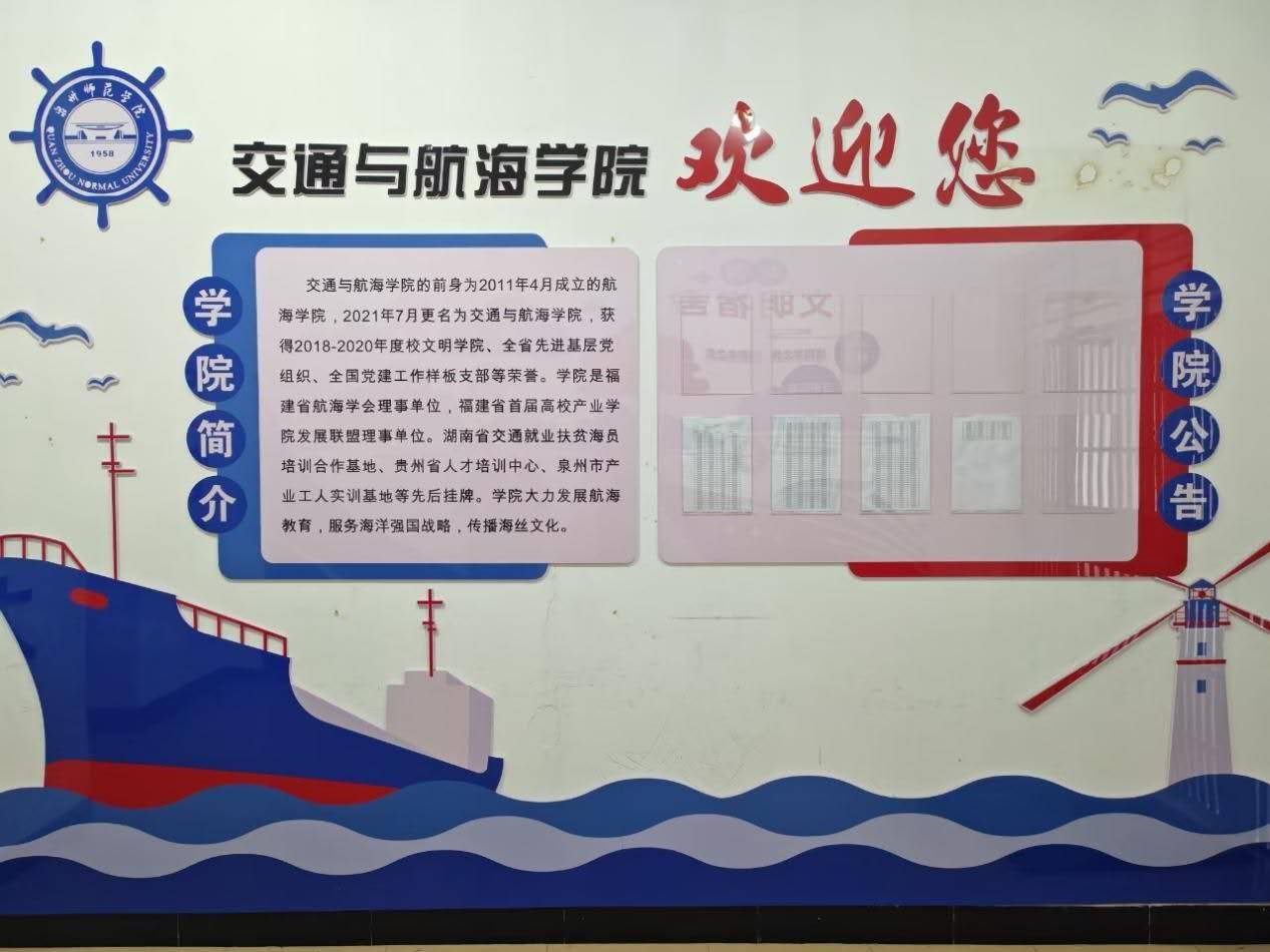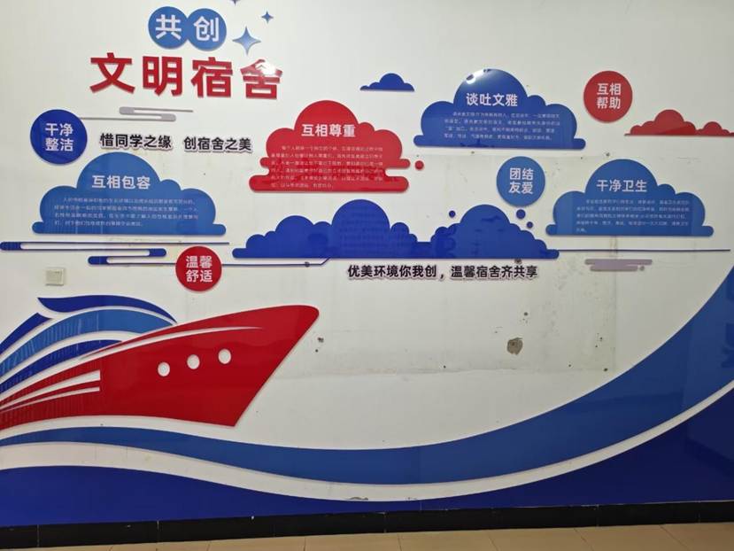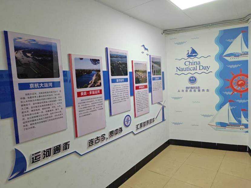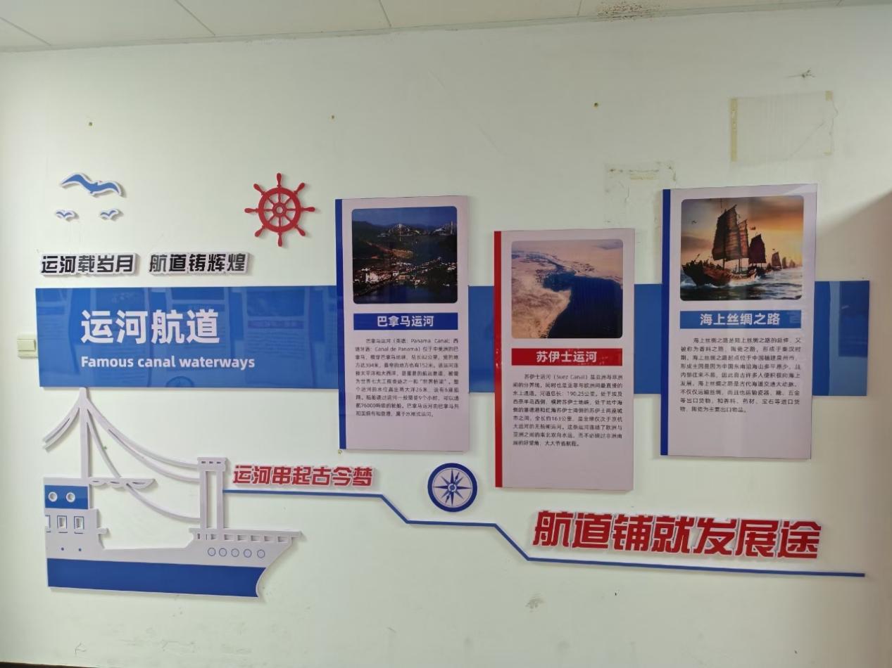 交通与航海学院则围绕航海文化打造主题文化墙,采用环保乳胶漆、PVC等材料,生动呈现郑和、哥伦布等中外航海先驱事迹,并融合运河航道、机舱动力装置等专业元素。蓝白红主色调搭配船舵、海鸥等图案,既传承航海历史,又彰显专业创新,使学子在沉浸式的空间中深切感受航海领域的历史厚度与学科魅力。