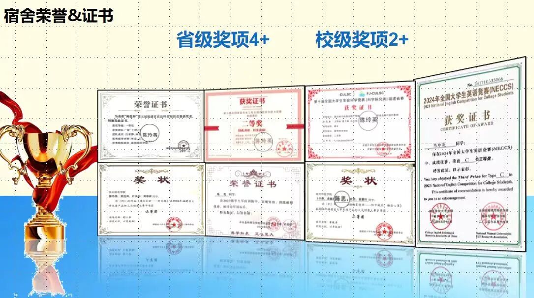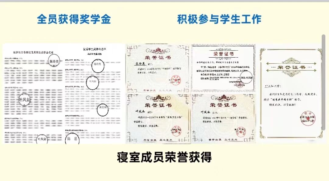 寝室成员始终保持良好的学习风气,她们努力提高自己的专业成绩,其中2人综测稳居前10%(陈玲英综测1/81,叶凤如5/81),宿舍全员综测专业排名均前50%。同时,她们积极组队参与各类学科竞赛并斩获佳绩,现已获省级奖项4+项,校级奖项2+项(如:在第六届福建省大学生海产品加工与创意大赛中荣获三等奖)。除此之外,两位学生干部积极参与学生工作并荣获多项个人荣誉(叶凤如获2023-2024年度“优秀学生干部”称号;陈思和叶凤如在“追寻领袖足迹,体悟伟大变革”2024年福建省大学生暑期社会实践活动中荣获优秀实践成果)。截至目前,宿舍全员均获得奖学金,累计10次+,多人获评“三好学生”荣誉称号(如陈玲英、叶凤如均荣获2023-2024学年“三好学生”荣誉称号)。