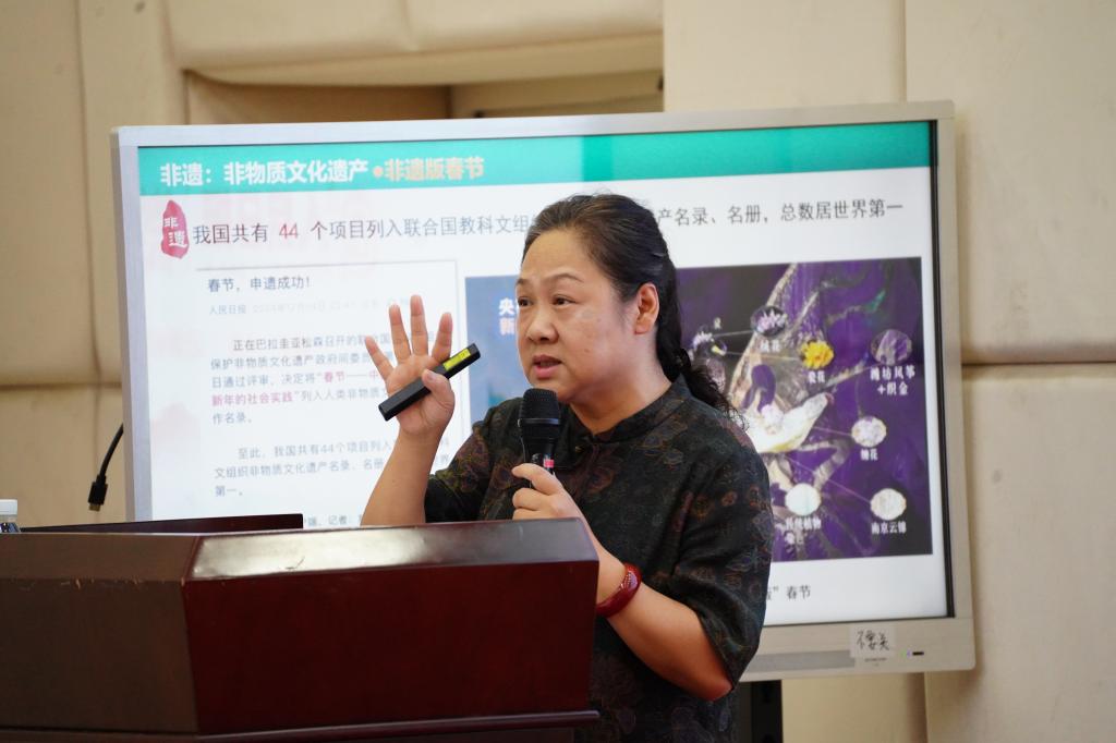 张华以中国非物质文化遗产作为内容切入,生动展示了中华文化的博大精深,她指出,春节的申遗成功是中国文化受到世界广泛认可的一个缩影,更是建设社会主义文化强国的生动写照。围绕“加快建设社会主义文化强国”的主题,她从为何要建设社会主义文化强国、社会主义文化强国建设取得的成就、如何加快建设社会主义文化强国三个方面进行阐述。