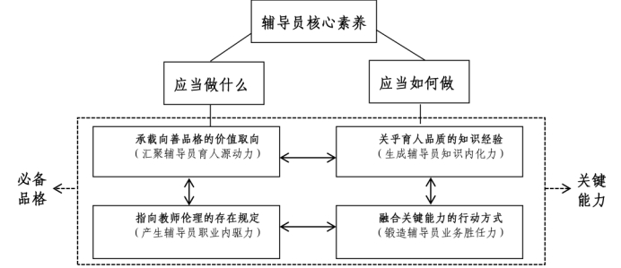 近年来,有学者开始将“核心素养”引入高校辅导员队伍建设领域,有关全国高校辅导员的一项活动在名称上也发生了从“职业技能”到“职业能力”再到“素质能力”的转变。不难发现,辅导员职业成长发展从知识本位和技能本位逐渐转向素养本位的观点已得到业界的普遍认同。辅导员核心素养聚焦具体教育情境中如何提升外部适应能力和自我创造能力,包括“必备品质”和“关键能力”双重要素,是对如何“用心”去“成人”和“成己”的追问,最终指向学生个体生命成长和个人职业发展的逻辑归宿,其中“必备品质”本质是价值判断,是对“应当做什么”的理性关切;“关键能力”是“实际如何做”的实现手段。这样的核心素养既关切学生生命的卓越发展,又关乎自身职业成长的美好成就,需要以恰到好处的行为和感情,协调互作的德性和能力,兼顾统筹的情境和场景来决定在育人工作中“辅导员应当做什么”和“辅导员实际如何做”。