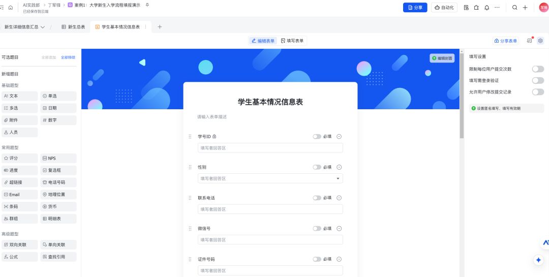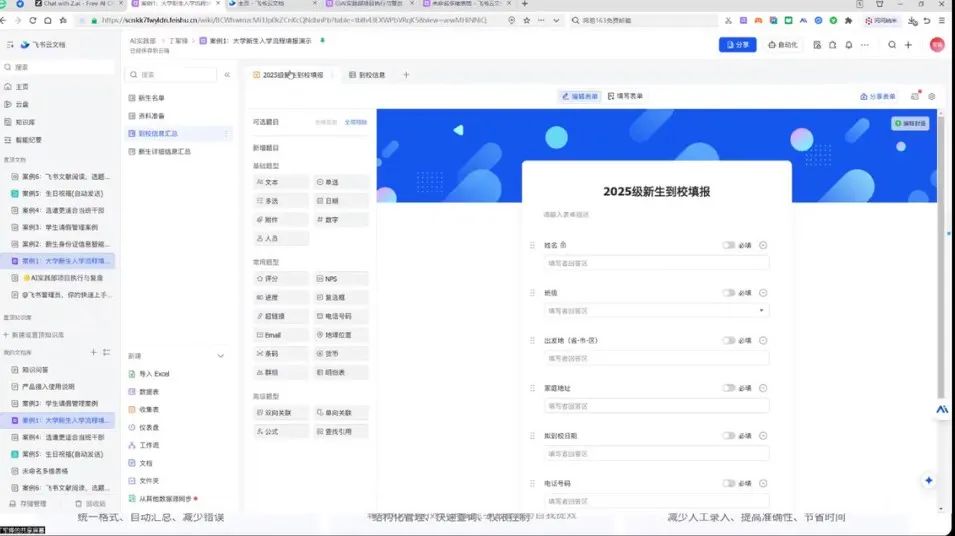 新生入学信息收集是辅导员面临的第一个挑战。通过飞书表单功能,辅导员可以快速创建信息收集表单,设置必填项和分组···