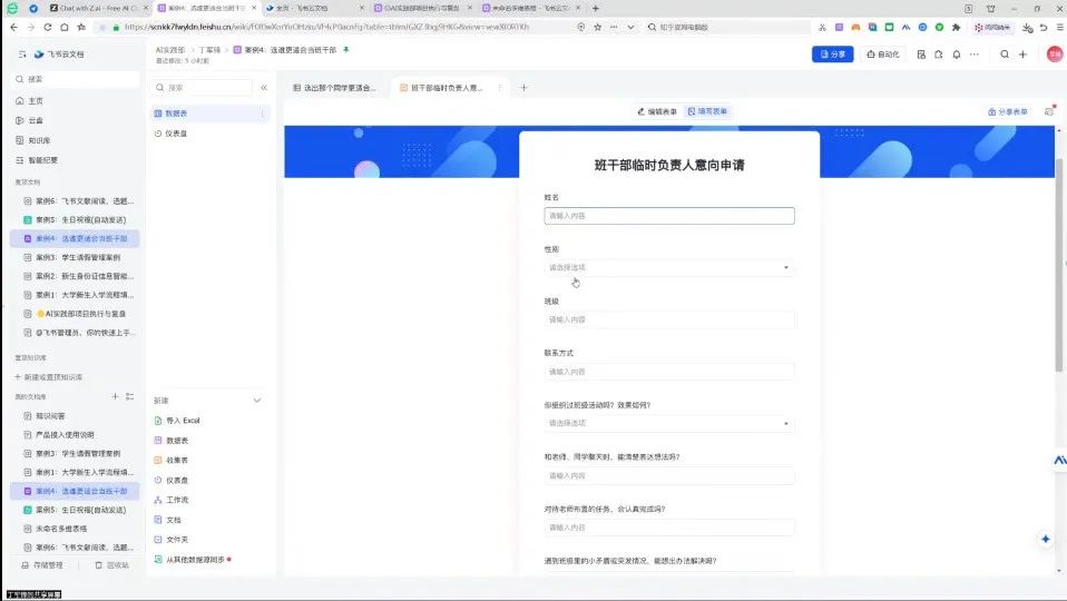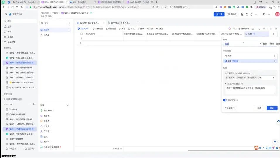在班干部评选场景中,飞书的AI评估功能展现出独特价值。辅导员可以设计包含竞选岗位、自我陈述、干部经历等字段的表单,通过AI字段捷径自动分析每位候选人的适配度并给出推荐理由。系统还能生成看板视图,按岗位分组展示候选人信息,支持拖拽排序。这种数据驱动的评选方式,不仅提高了公平性,还为辅导员提供了客观的决策依据。