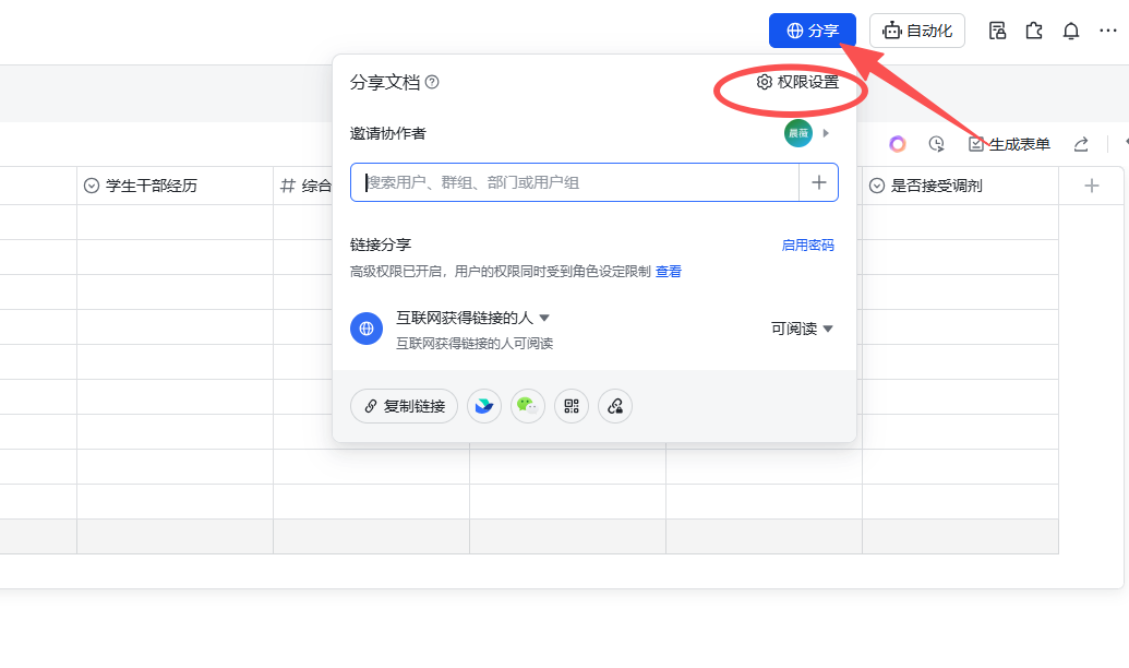 3. 右侧开启 “对外分享” 互联网获得权限的人→ 复制二维码或链接到新生群即可填报信息。