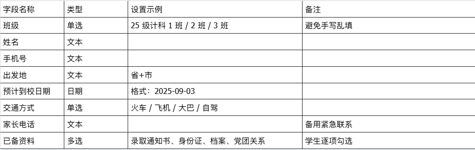 场景痛点:新生入学信息收集是辅导员面临的第一个挑战。通过飞书表单功能,辅导员可以快速创建信息收集表单,设置必填项和分组选项,学生扫码即可填写。系统会实时汇总数据,并按到校日期自动分组,辅导员可以随时掌握报到进度。这种方式不仅提高了效率,还避免了传统纸质登记易丢失、统计耗时的弊端。