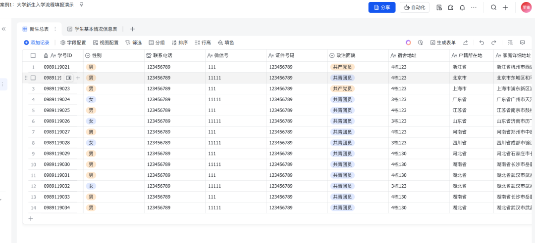 飞书提供了六种视图方式,包括表格、看板、日历、甘特、画册和表单,每种视图都针对不同场景进行了优化。例如,表单视图非常适合用于信息收集,而甘特视图则能清晰展示项目进度。此外,飞书的字段捷径功能是一大亮点,能够自动处理身份证信息提取、识别等复杂任务,极大减轻了辅导员的数据处理负担。