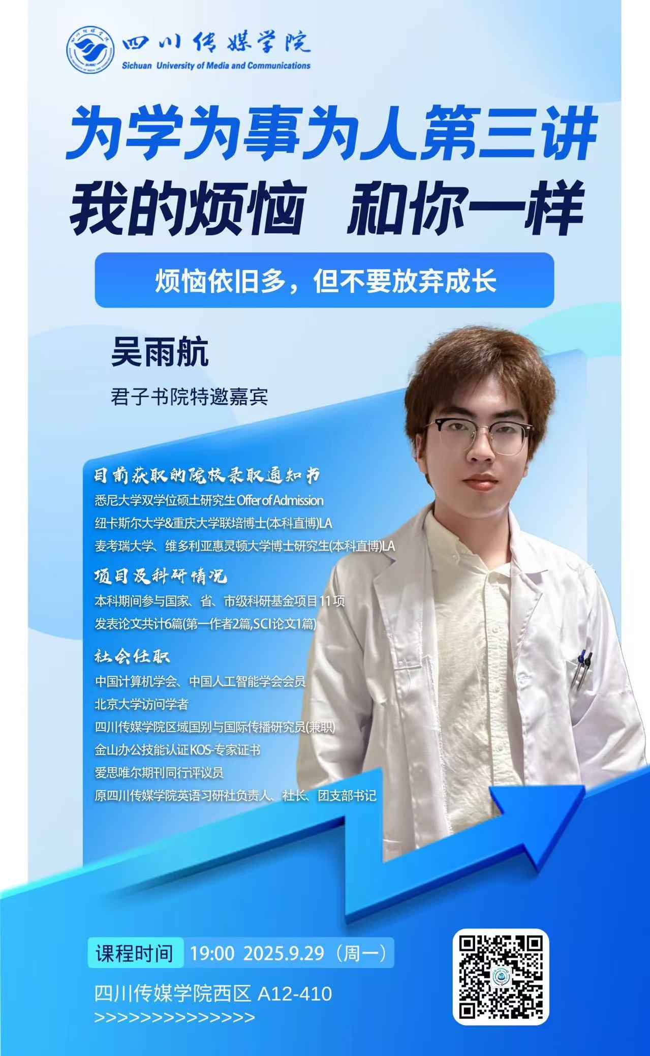 听完吴学长的分享,手里的笔都没放下——他讲的那些事儿,简直就像我现在的生活写照。作为一名大二学生,高中的遗憾、当下的迷茫,被他一一道来,突然觉得自己这点困惑,原来早就有人经历过。