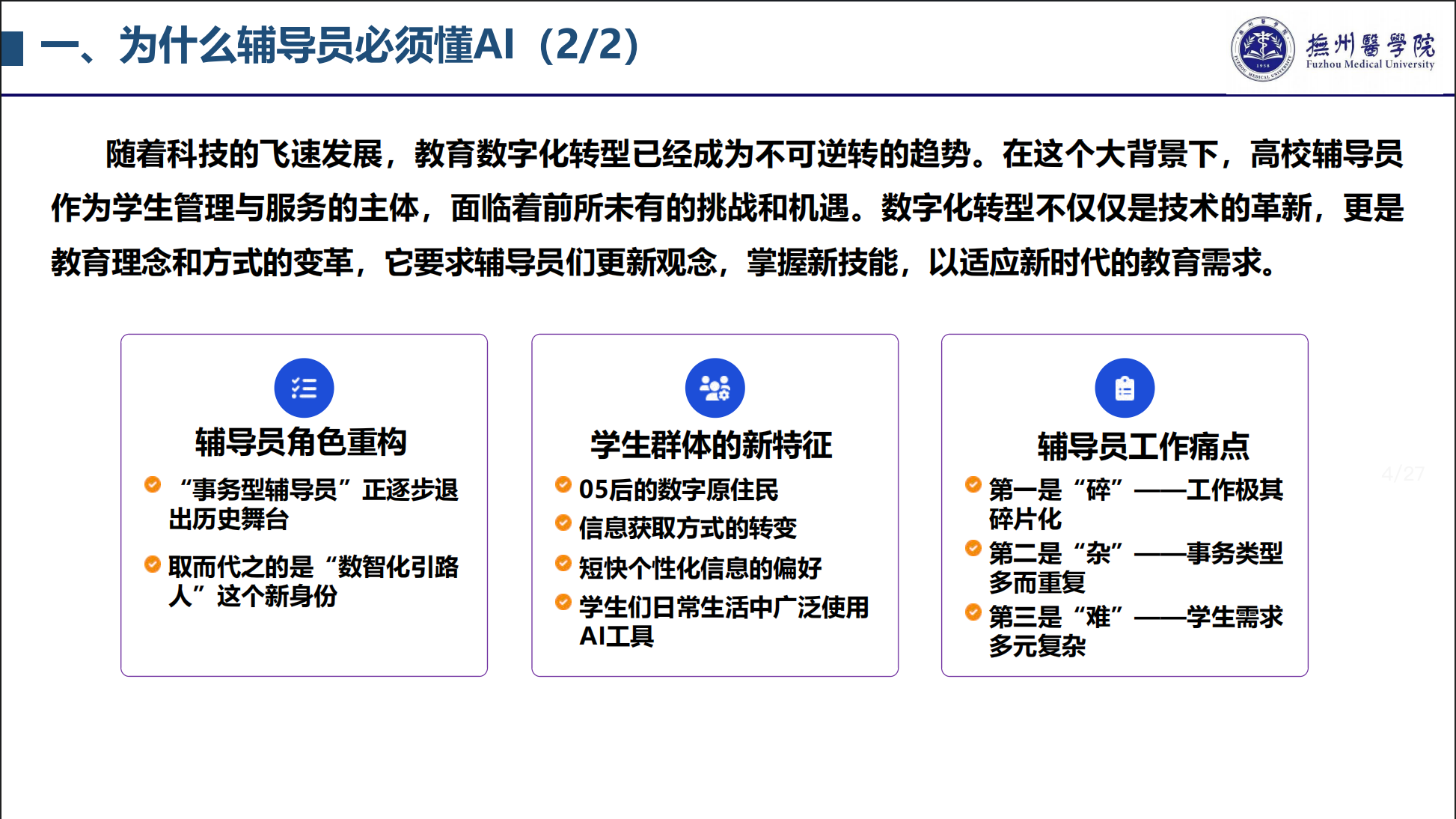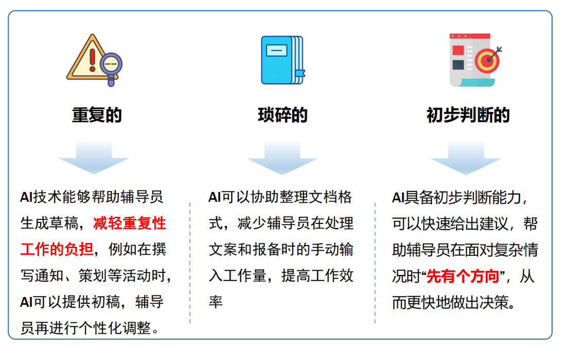 AI可针对性解决辅导员事务碎片化、重复性任务繁重、学生需求多元化三大核心痛点,如自动生成文档、快速处理数据、识别学生潜在危机等。