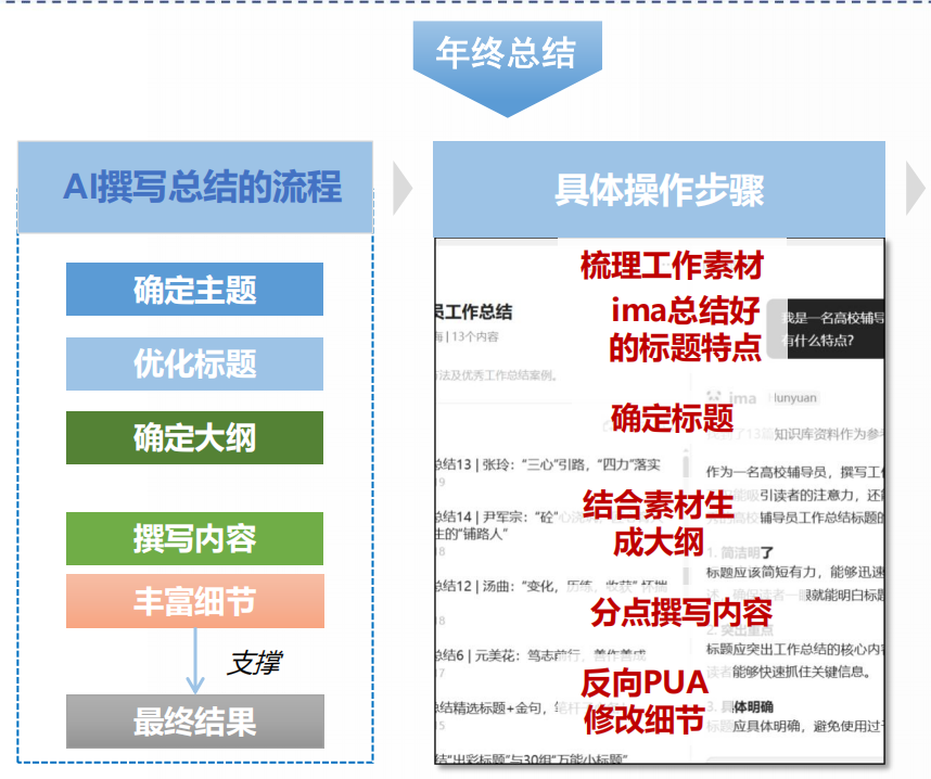 梳理原始素材后,用AI分析优秀总结特征,生成定制化大纲,分模块撰写并反向提问优化。