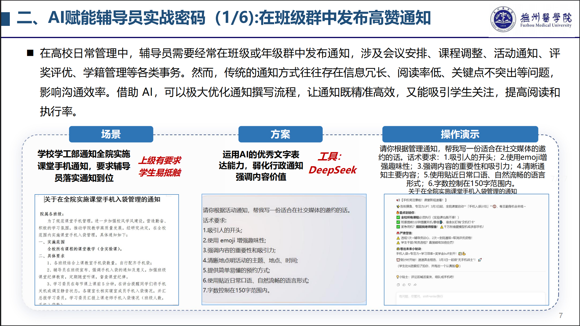 传统通知常因阅读率低、信息误读影响效果。用AI优化通知需包含社交媒体适配文案、表情包、悬念式标题等要素,例如 “手机党注意了!告别摸鱼,评论区喊出室友组队”,同时将政策要点可视化,能有效提升学生接受度,助力学风建设。