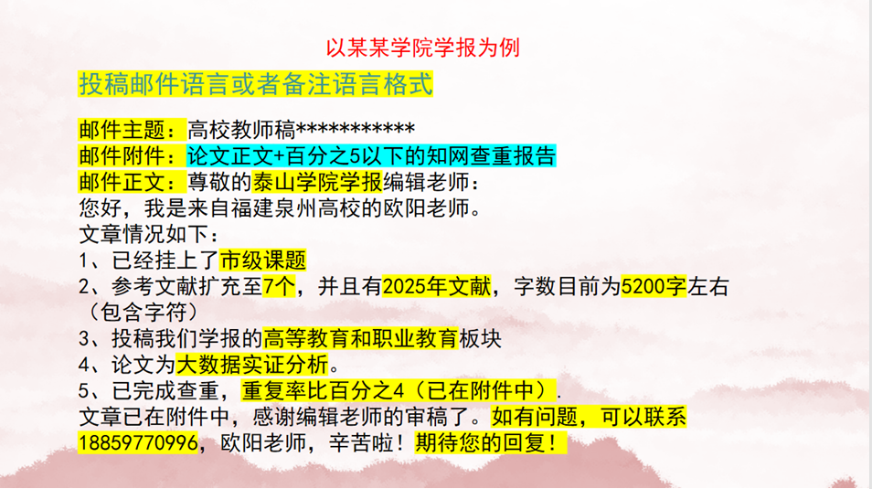 • 格式规范:投稿邮件需包含清晰主题(如 "高校教师投稿 - XXX 课题 - XXX 题目")、论文正文 + 知网查重报告(重复率建议≤5%),正文注明课题支撑、参考文献数量(建议≥7 篇,包含近年文献)、字数等关键信息;