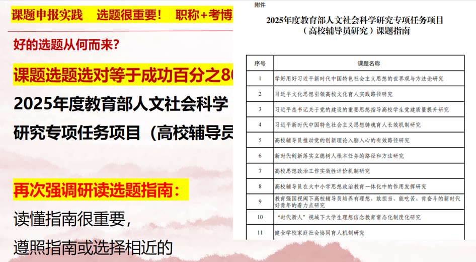 • 研读选题指南,优先选择指南明确支持或相近方向(如 2025 年教育部辅导员专项课题中的 "党的创新理论入脑入心路径研究");