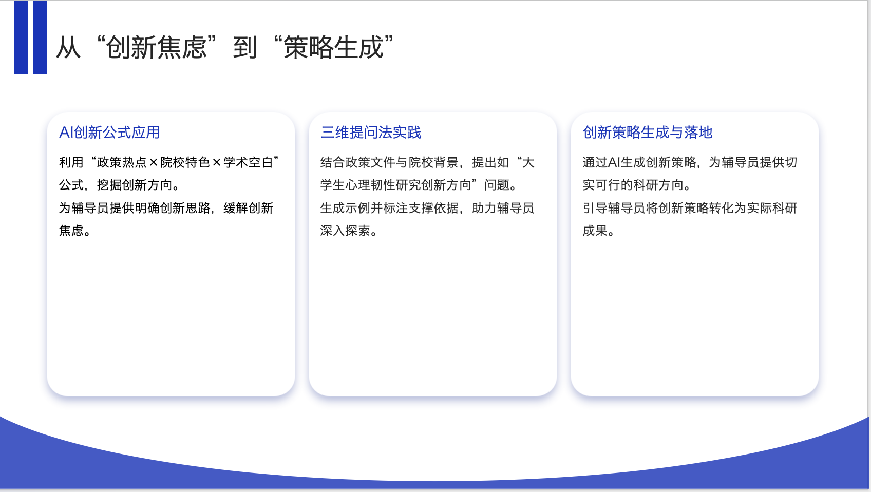 辅导员日常工作繁忙,课题申报常面临拖延困境。AI 的价值在于承担信息检索、材料优化等基础工作,让辅导员聚焦教育情怀与核心创意 —— 它不是替代人类思维,而是从功能赋能、思维聚焦到质量控制的三重进阶工具。