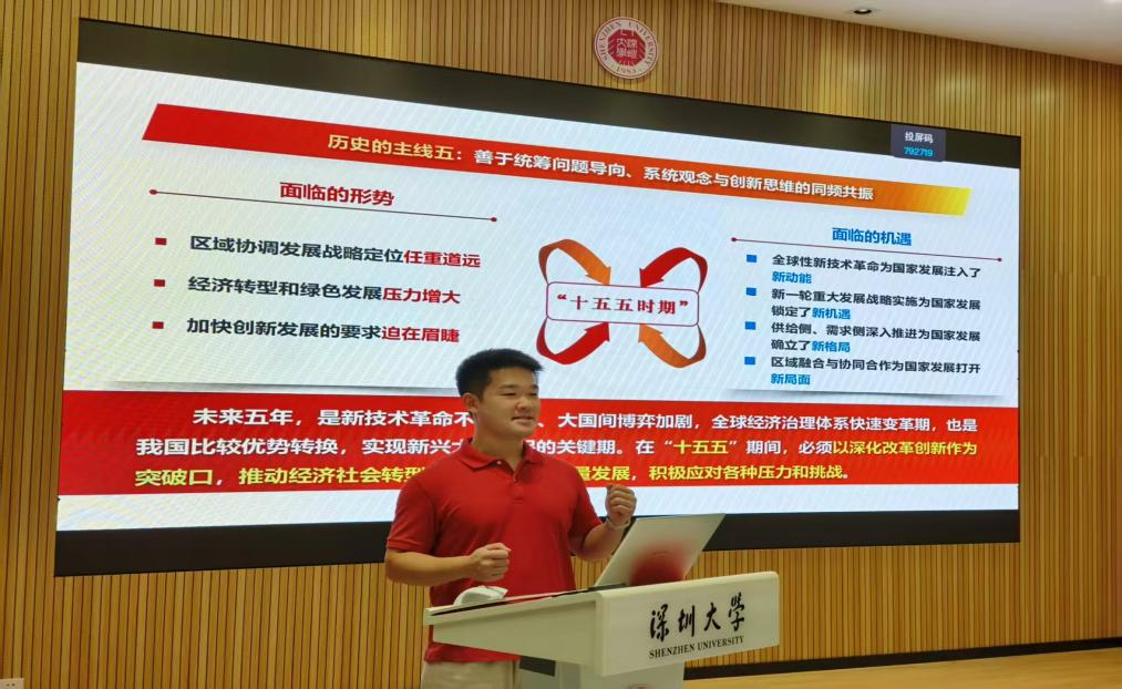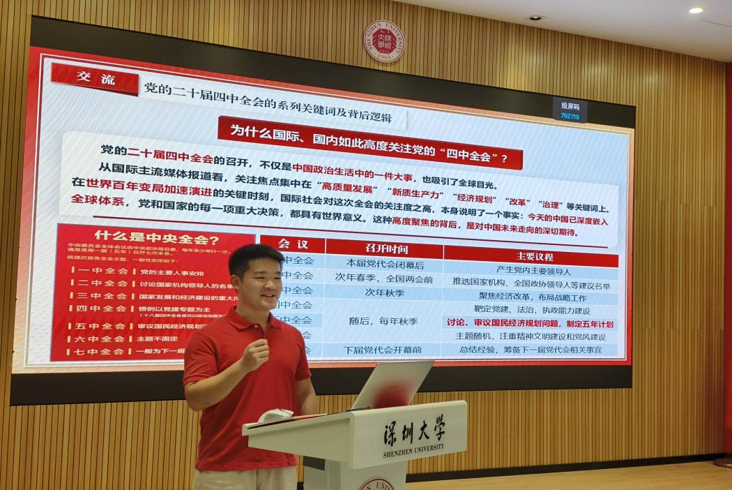 随后,在中国经济特区研究中心学生党支部书记熊老师的领学下,全体同学专题学习了中国共产党第二十届中央委员会第四次全体会议公告及相关精神。熊老师通过向众人播放纪实视频和解读公报,重点聚焦了国民经济和社会发展第十五个五年规划中产业发展和城乡建设的相关内容。他鼓励同学们准确把握“十五五”时期党和国家事业发展所处历史方位,增强对发展成就的认同,紧紧抓住时间窗口,在深大就读期间不断增强理论学习和提高个人素质,未来在中国式现代化进程的广阔天地中大展拳脚。