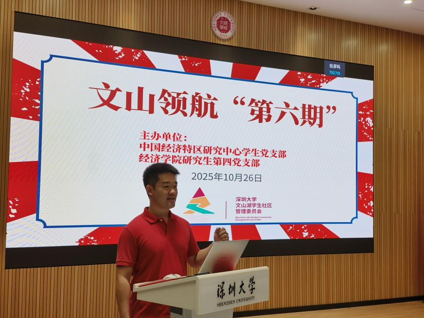 2025年10月26日19时,文山湖学生社区管委会在紫薇斋106活动室举办“文山领航”第六期学生党建学习活动,50余位来自不同院系的社区同学参加了此次活动。本次党建活动由文山湖社区熊思成老师主持,邀请经济学院研究生第四党支部参与共建。