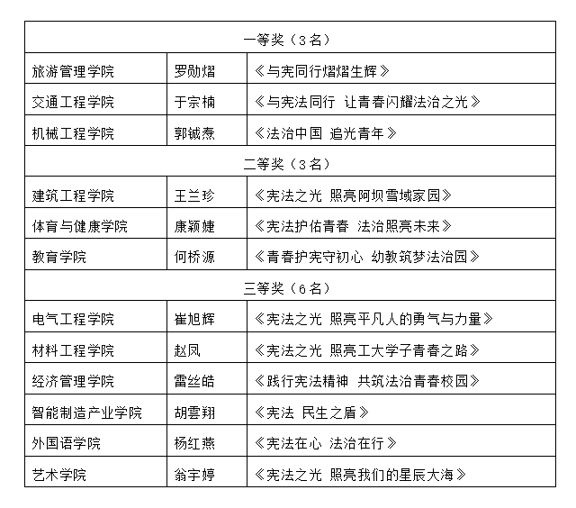 比赛现场,来自12个学院的12位选手依次登台。他们以具体鲜活的实际案例和生动形象的语言表达,深刻阐述了各自对宪法的理解与感悟,充分展现出当代大学生独特的个人风采与法治素养。经过激烈角逐,比赛结果尘埃落定。评委们从演讲内容、语言表达、形象等多个维度进行综合打分,最终评选出以下奖项: