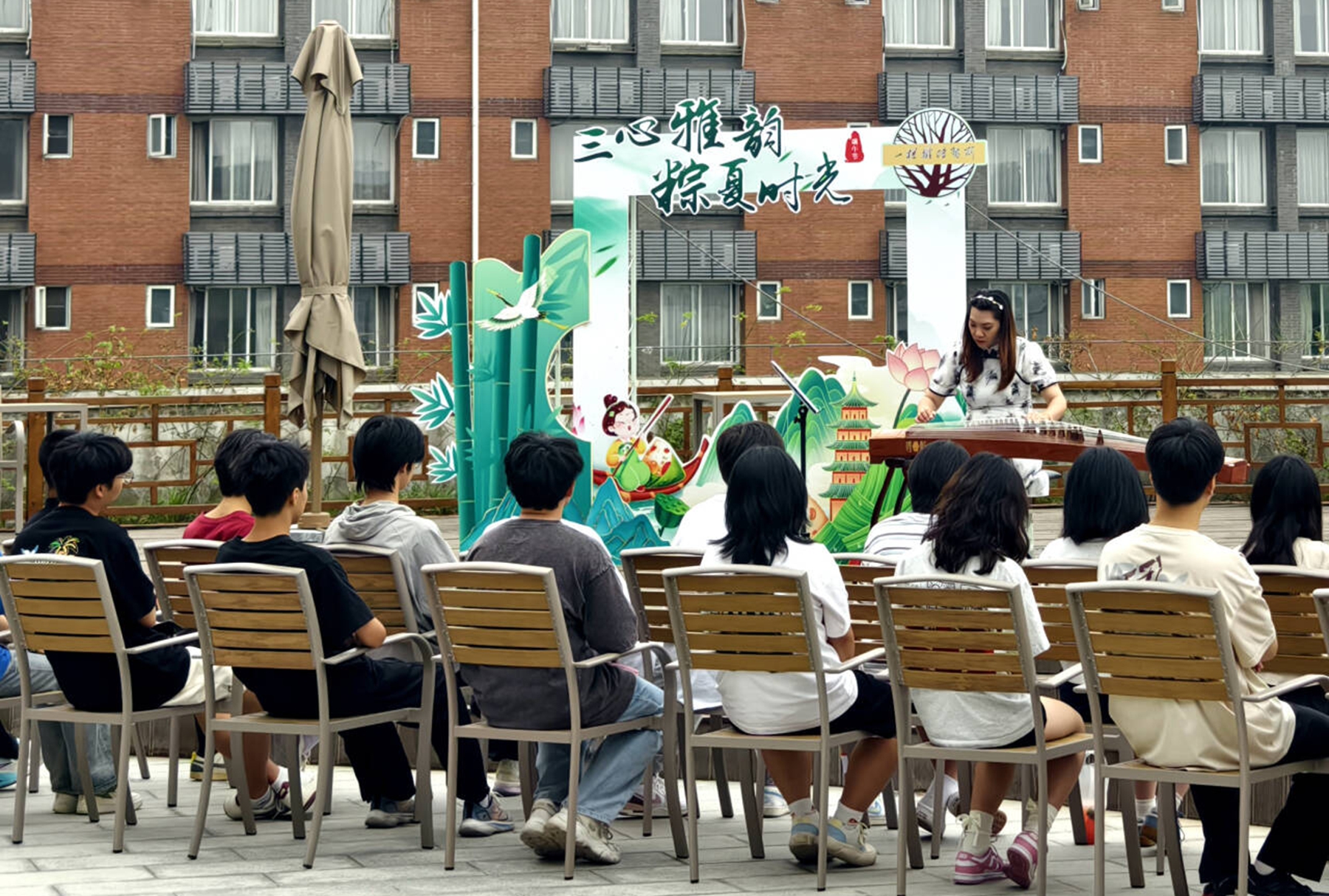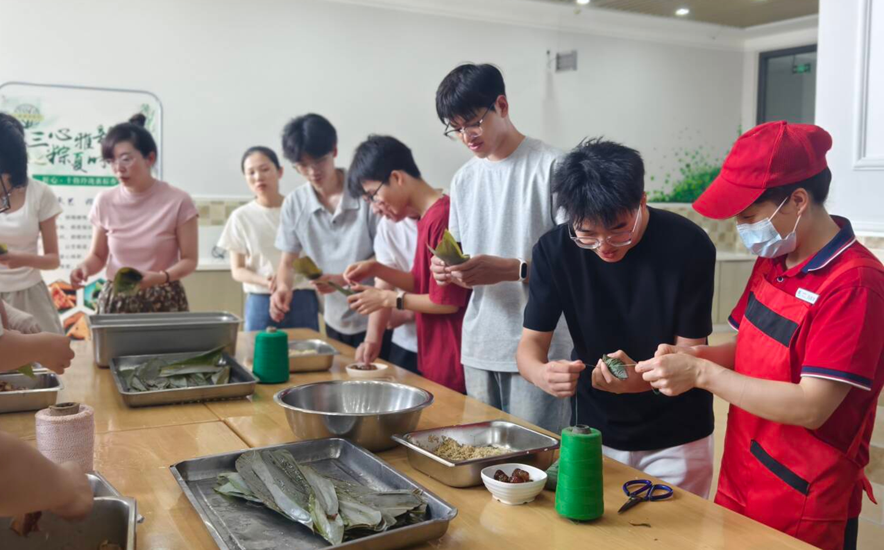 活动现场设置了“茶心”“琴心”“匠心”三大体验区,构建起一个立体化的传统文化体验空间。在“茶心”体验区,旅游管理学院王芳和王苏两位老师现场演绎传统茶道,同学们在氤氲茶香中学习“以茶明心”的处世哲学。“琴心”区域则回荡着悠扬的古筝琴声,师生们共同聆听机械工程学院张议丹老师的《离骚》等古筝曲,在琴弦拨动间追思屈原的家国情怀。最热闹的当数“匠心”体验区,师生们围坐在一起,在后勤服务中心徐阳平老师和面点师傅的指导下学习包粽子,从选叶、填料到捆扎,每一个步骤都凝聚着传统技艺的智慧。