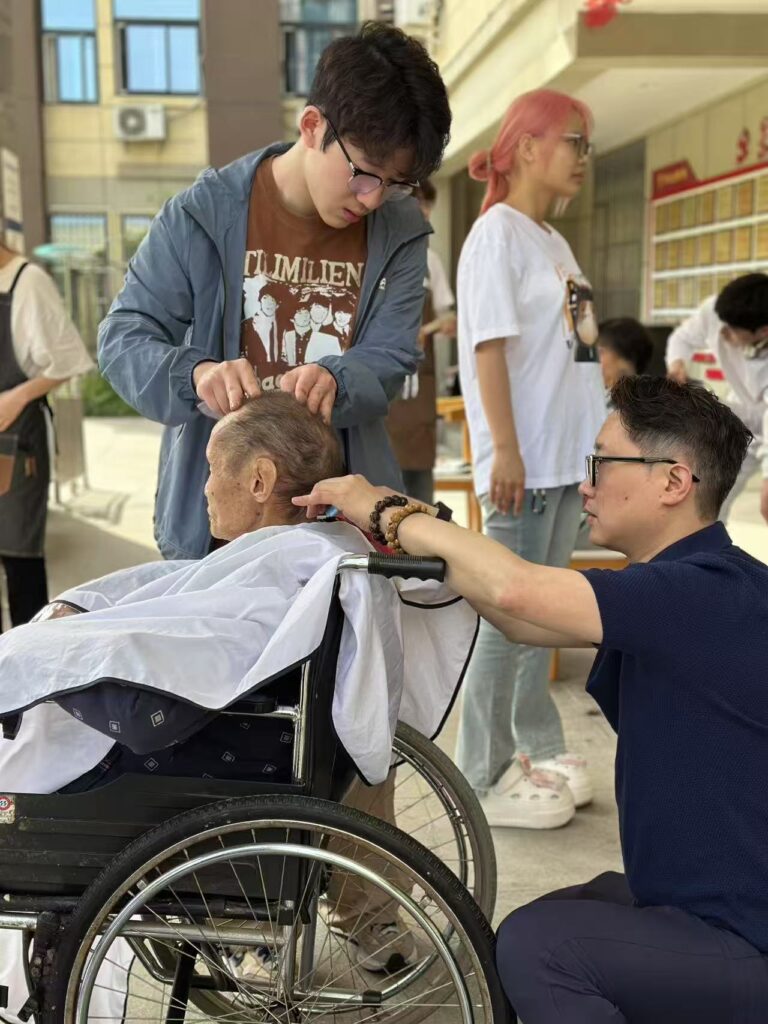 活动当天,同学们早早来到龙泉聚宝山养老中心,为养老院的老人提供免费理发服务,帮助老人们修剪头发、整理仪容,让他们以清爽的精神面貌迎接节日。在剪发的间隙,同学们还与老人们唠家常、聆听他们的人生故事,在互动中传递温暖,缓解老人们的孤独感。