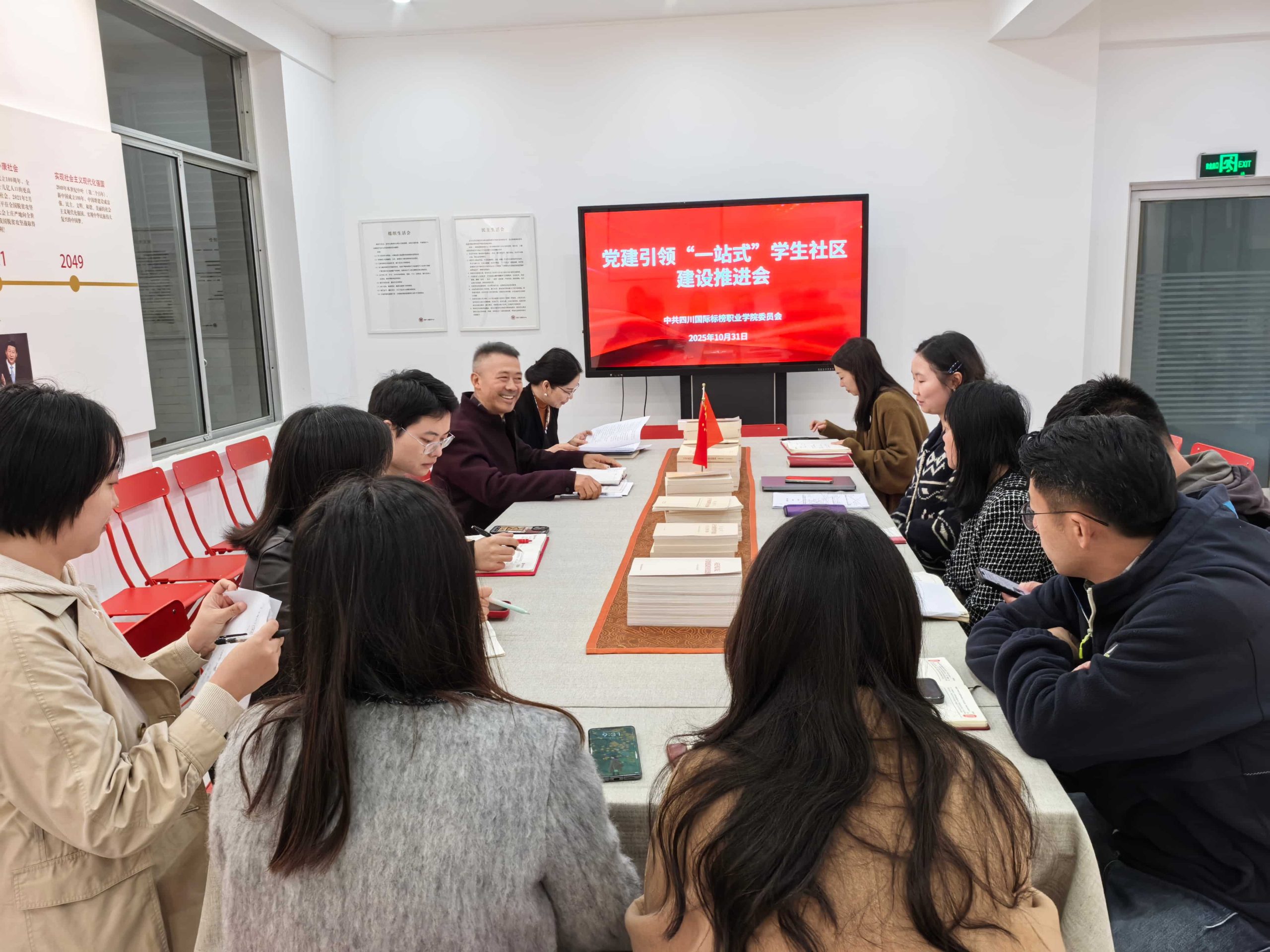 为深入贯彻落实新时代立德树人根本任务,扎实推进“一站式”学生社区建设,全面提升党建工作在学生社区中的引领作用,2025年10月31日9:30至11:00,党建引领“一站式”学生社区建设推进会在党群工团服务中心召开。会议由学校党委副书记孙启平主持,党委、学工、理事办、事业发展部相关工作负责人、老师及各二级学院党总支书记参加会议。