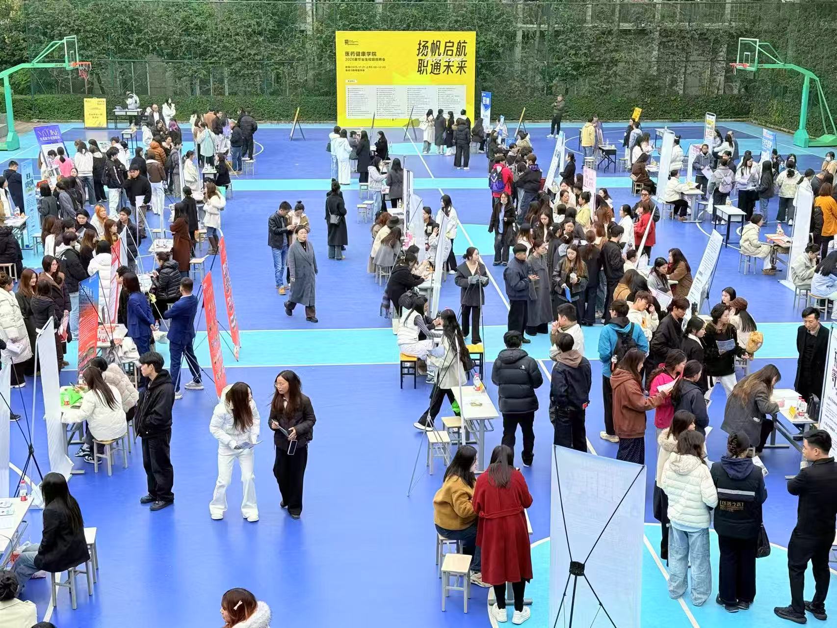 11 月 21 日上午,招聘会核心环节 –企业双选会在学校篮球场隆重举行。本次双选会规模空前,共吸引 65 家优质用人单位参会,涵盖各级医疗机构、医药企业、健康管理机构、美容养生连锁品牌等多个领域,累计提供就业岗位 1000 余个,岗位类型覆盖临床护理、药学服务、健康管理、医学技术、美容运营等多个专业方向,充分满足了不同专业毕业生的就业需求。