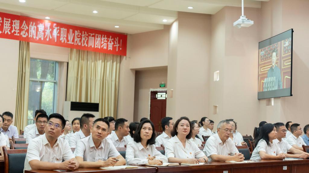 上午8时许,师生们按照学校之前的统一部署安排,有条不紊地进入分会场,多功能演播厅、教学楼教室、办公楼会议室、支部党员活动室......各个分会场都洋溢着庄严、肃穆、热烈的气氛。