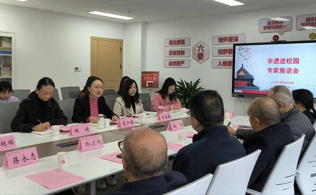 为充分挖掘区域特色文化资源,加强校地企合作,11月13日,人文社科基础教育学院在青马大楼二楼会议室举行“非遗进校园”专家座谈会,覆盖四川省、成都市、都江堰市不同评定级别的非遗技艺传承人,都江堰政府和企业相关负责人、文化学者应邀到会。人文学院党总支书记杨婧、副院长夏仁娟及院级中华优秀传统文化科研创新团队成员参加会议。校地企三方围绕非遗活态传承、校地企合作、人才培养等议题展开深入交流研讨。