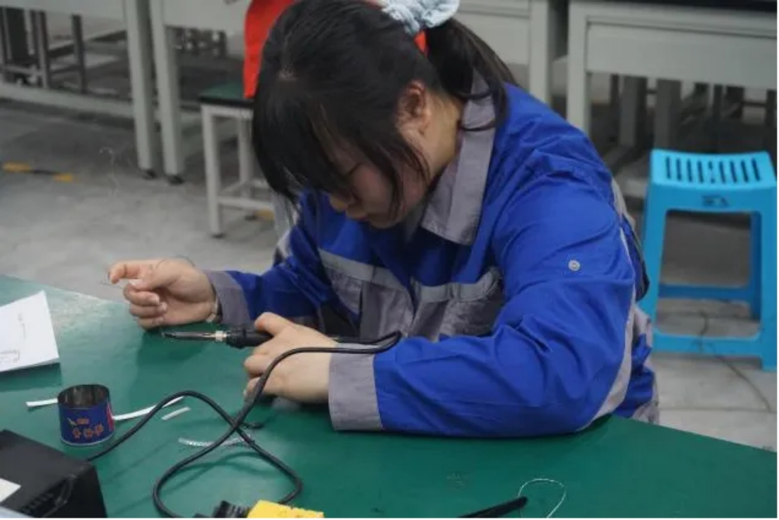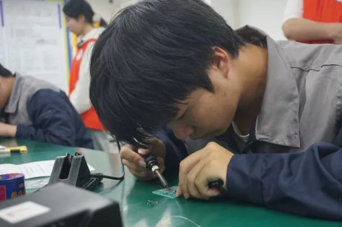 下午电子技能大赛要求参赛者按照电路原理图将电子元器件焊接在电路板上相应位置,并实现其功能。现场选手们凝神屏息,以熟练的操作技术完成电器焊接等操作,同学们以严谨的操作态度展现了精益求精的工匠精神与实践创新能力。