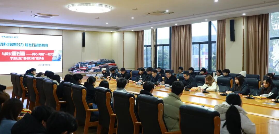 新春将至,寒意渐浓,却挡不住校园里涌动的温情。2026年1月21日,与院长面对面——同心·向阳“一站式”学生社区“暖冬行动”座谈会在护国校区综合办公楼第一会议室举行。学校党委副书记、院长文申柳,党委委员、副院长徐淳与家庭经济困难学生代表齐聚一堂,以“党建引领聚合力·暖冬行动践初心”为主题,共话成长、共商帮扶,用实际行动为特殊困难学生送上冬日里的暖心关怀与新春的美好祝福。