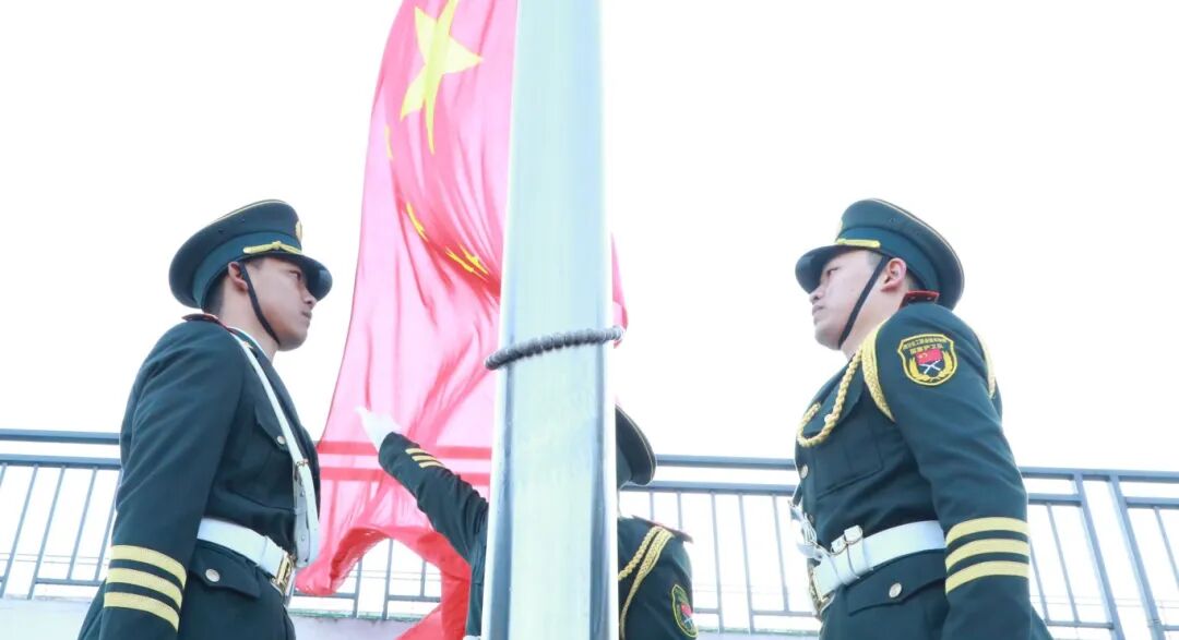 伴随着雄壮激昂的国歌声,五星红旗冉冉升起、迎风飘扬,全体师生肃立,行注目礼,高唱国歌。
