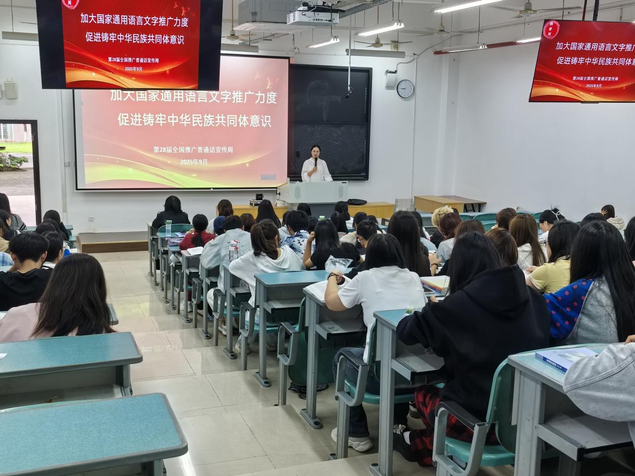 根据推普周精神,我院积极推广普通话进课堂。在中华优秀传统文化课程教学中,我们适时增设语言文字板块,讲解巴蜀文化中的语言文字知识;在普通话课程教学中更加注重实践教学,通过朗读、演讲等形式,提升学生的普通话水平。此外,各班级还召开了推普主题班会,班主任和语文教师引导学生进行普通话交流,纠正发音错误,营造了浓厚的普通话学习氛围。