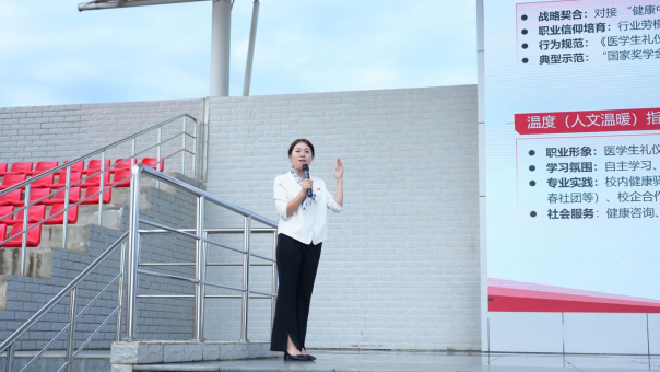 升旗完毕后,学院党支部书记杨敏做了题为“红医铸魂强根基、‘四度’融通启新程”主题讲话。医护康养学院结合“五育并举”、生涯理论与大健康行业发展现状,医护康养学院构建三维递进育人模型,以厚度(医德深厚)、温度(人文温暖)、宽度(视野宽阔)、精度(技术精湛)四维协同培养,设具体指标,目标是使学生德技并修,契合行业需求,助力高质量就业。