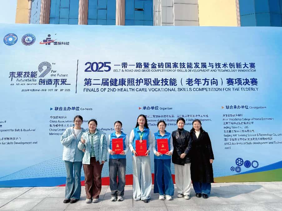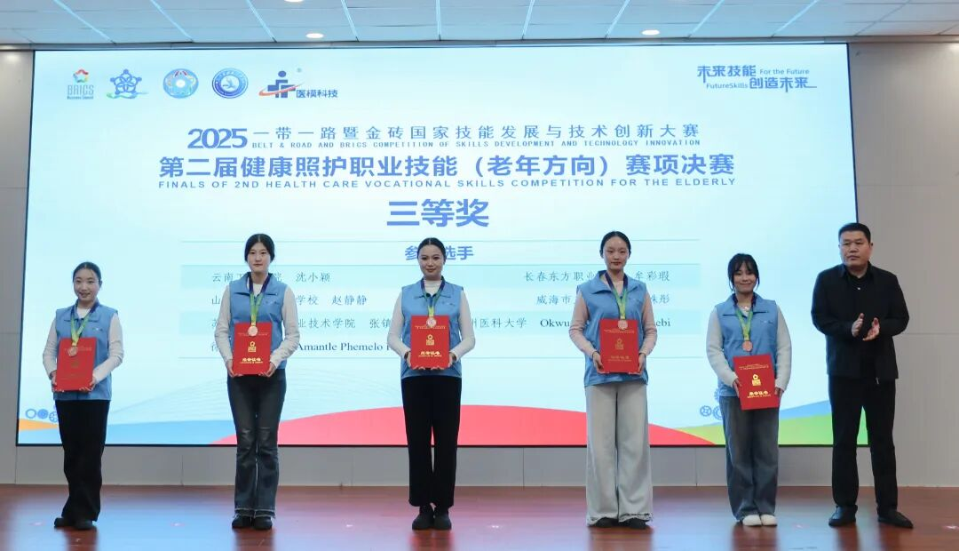 近日,2025“一带一路”金砖国家技能发展与技术创新大赛——第二届健康照护(老年方向)赛项全国总决赛圆满落幕。华新职院医护康养学院代表队凭借扎实的专业功底和出色的现场表现,历经层层选拔与激烈角逐,最终荣获全国总决赛三等奖的优异成绩,并在前期选拔赛中斩获一等奖、三等奖、优秀奖各一项,充分展现了华新学子的精湛技能和良好风貌。