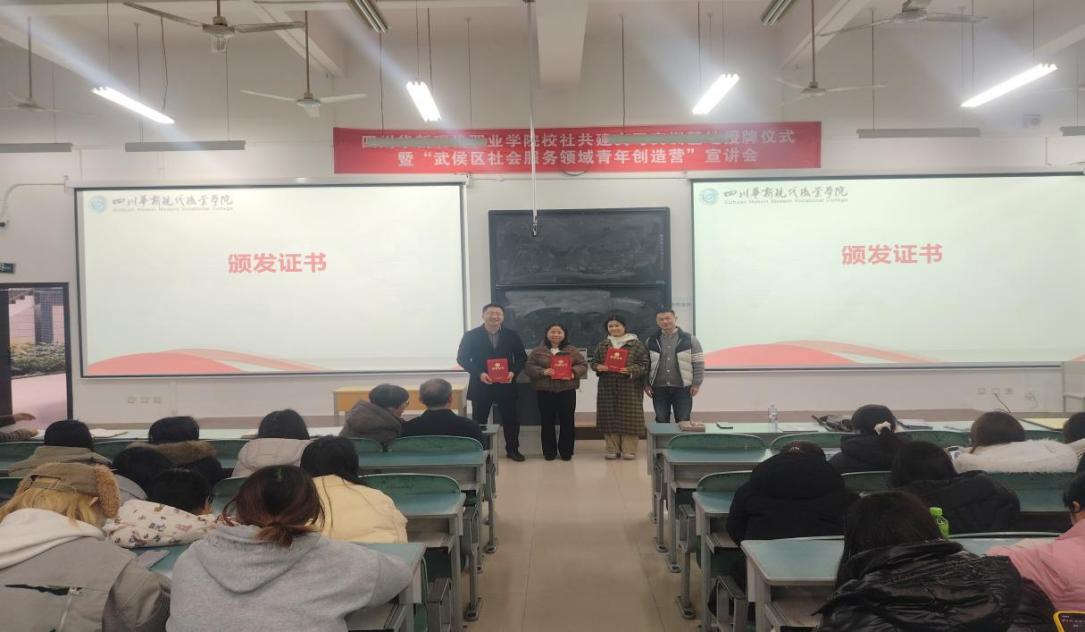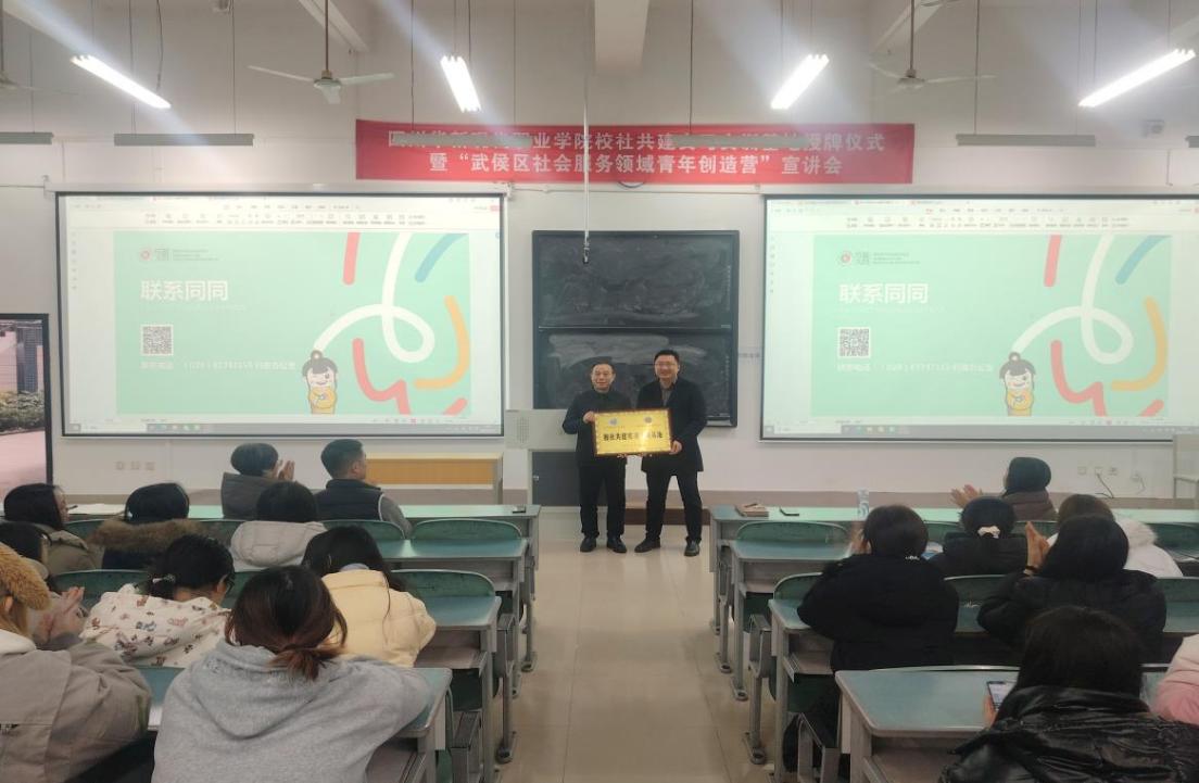 2025年12月19日,华新职院与成都市大同社会工作服务中心(以下简称“大同社工中心”)举行校社共建实习实训基地授牌仪式,并同步启动面向学生的“武侯区社会服务领域青年创造营”项目宣讲。此举旨在深化产教融合,为社工专业学子拓展高质量的实践平台与就业渠道。大同社工中心理事长黄皓、青创营负责人钟雪芳、助理总干事林倩,学院党委副书记、院长刘斌,副院长王力洪、教育学院院长岳训涛共同出席活动。