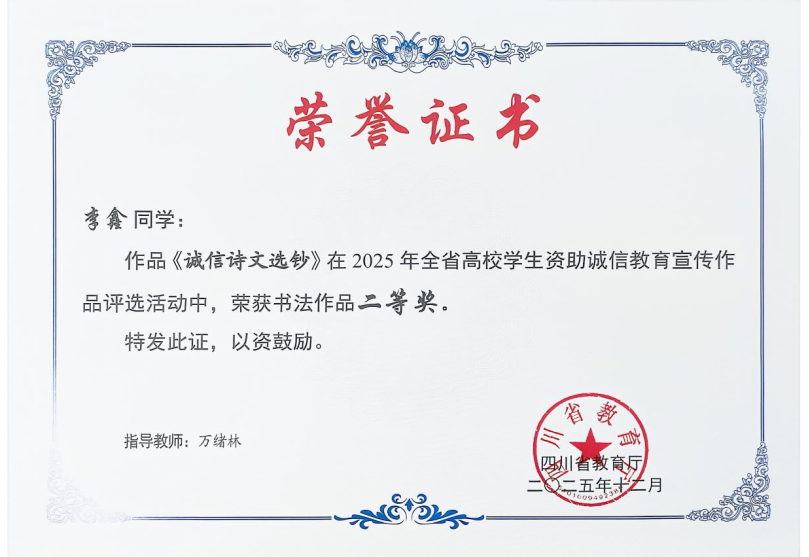 近日,由四川省教育厅、中国人民银行四川省分行联合主办的2025年全省高校学生资助诚信教育宣传作品评选结果正式公布,计算机与大数据学院学生李鑫书法作品《诚信诗文选钞》在全省212幅作品中脱颖而出,凭借深刻的主题表达与扎实的书法功底荣获二等奖!