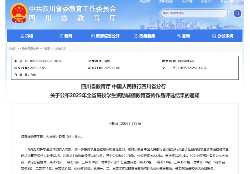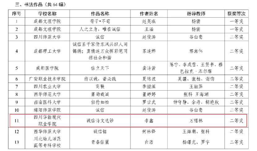 四川华新现代职业学院荣获全省高校诚信教育作品评选二等奖