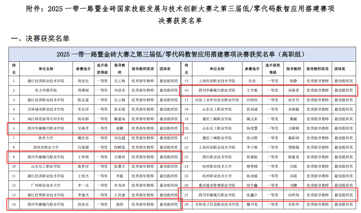 四川华新现代职业学院在2025年“一带一路暨金砖国家技能大赛”低/零代码国赛斩获佳绩