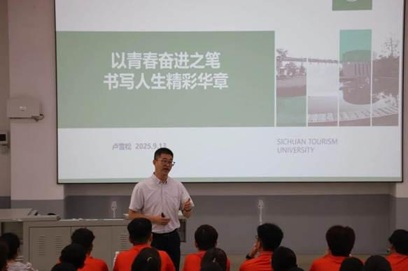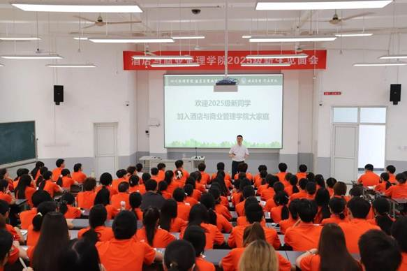 川旅新闻网讯(通讯员 郑源 摄影 黄佳瑶 文远荣)金秋九月,丹桂飘香,酒店与商业管理学院 2025 级新生怀揣着憧憬与期待,正式开启了崭新的校园生活。9 月 13 日,学院党委书记卢雪松以 “何谓大学”“为什么要上大学”“如何度过适应期”“大学如何奋斗” 为题,为新生们带来了一堂干货满满、意义深远的专题思政课,为大家未来的大学时光指引清晰方向。