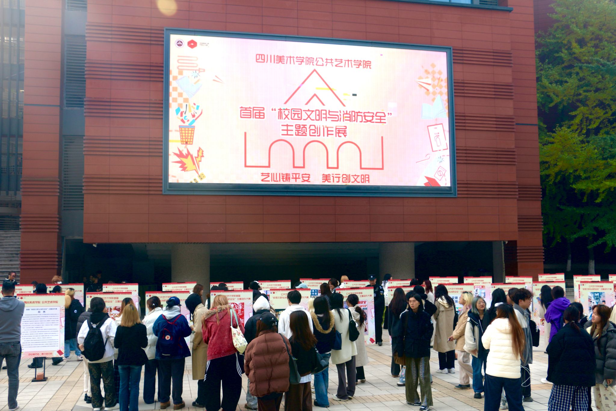 12月1日,公共艺术学院首届“校园文明与消防安全”主题创作展在黄桷坪校区举行,展览以“艺心铸平安 美行创文明”为主题,线下展览将持续一周。
