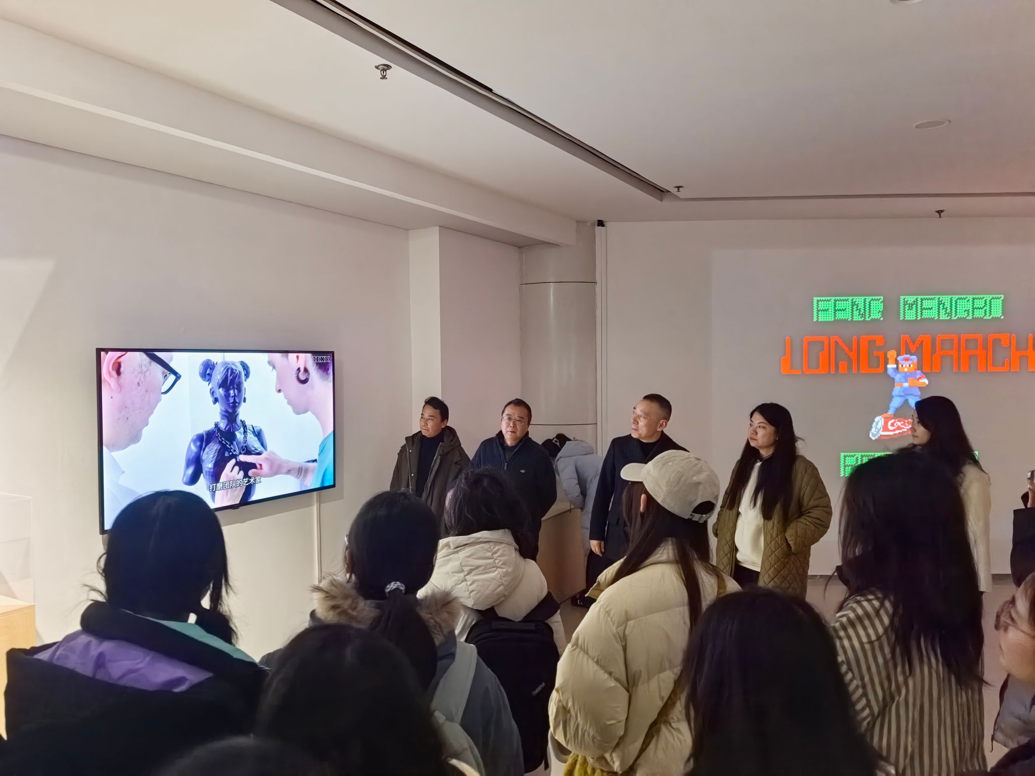 展览系统梳理了中国科技艺术自上世纪90年代以来的发展脉络,围绕“电脑”这一核心媒介,呈现从技术介入到艺术本体重构的演进路径。展览指出,科技艺术大致经历三个阶段:从摄影术带来的媒介介入,到计算机技术对创作本体的颠覆,再到当前由算法与数据平台重塑艺术系统的新阶段。这条线索不仅展现技术迭代,更折射出艺术观念与社会文化的深层互动。师生们在作品前驻足交流,结合现场讲解与沉浸体验,深入探讨艺术、科技与时代之间的关联。