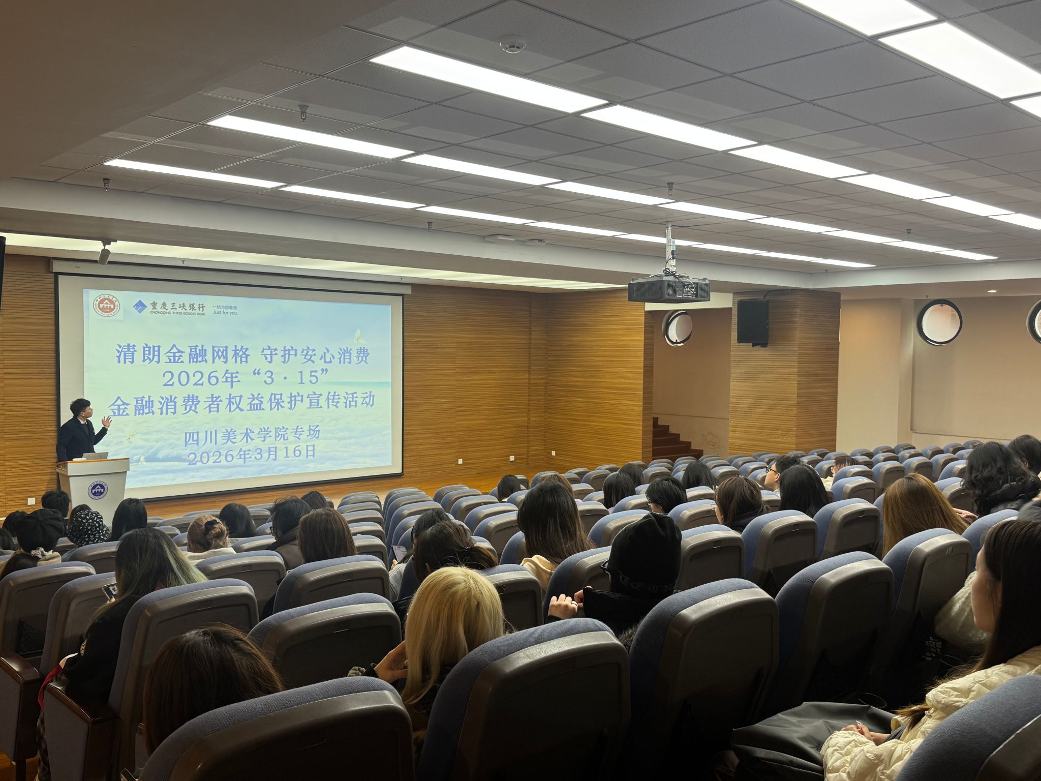 3月16日下午,公共艺术学院联合重庆三峡银行巴南支行,在黄桷坪校区举办“清朗金融网格 守护安心消费”——2026年“3·15”金融消费者权益保护宣传活动专场讲座,近100名师生到场参与。