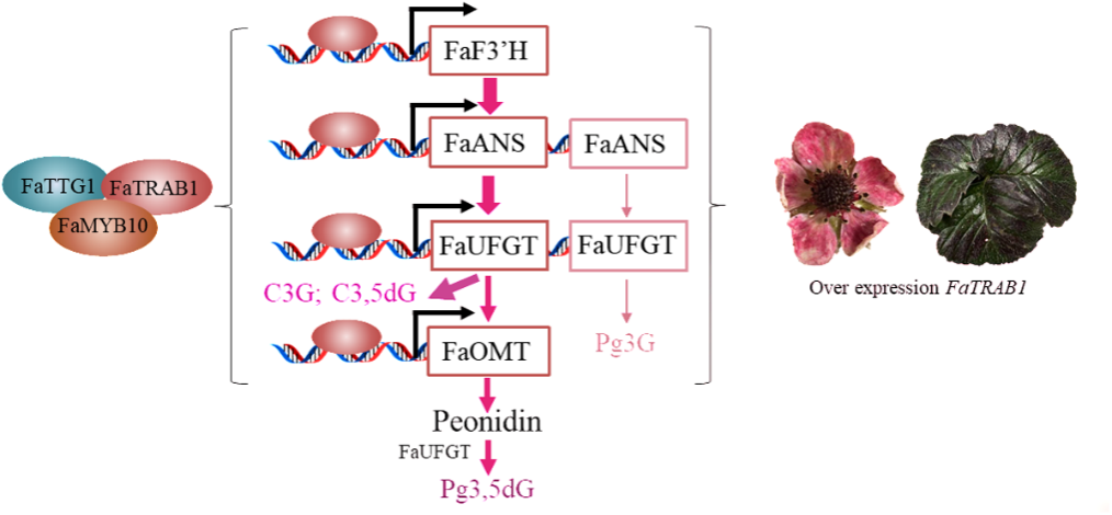 花青素是赋予果实鲜艳色泽、提升其市场与营养价值的核心物质,而FaTRAB1是一种能调控植物基因表达的bZIP转录因子。当FaTRAB1被“打开”时,它会与另外两个在果实着色中早已闻名的调控因子FaMYB10和FaTTG1结合,形成一个新型复合物,精准启动叶片的花青素合成程序,使原本绿色的叶片转变成紫红色。更有意思的是,FaTRAB1不是随便制造花青素,而是特异性促进了矢车菊素类衍生物的积累——主要包括:矢车菊素-3-O-葡萄糖苷(C3G),矢车菊素-3,5-O-二葡萄糖苷(C3,5dG)以及少量芍药素(Pg3,5dG)和天竺葵素(Pg3G)衍生物。