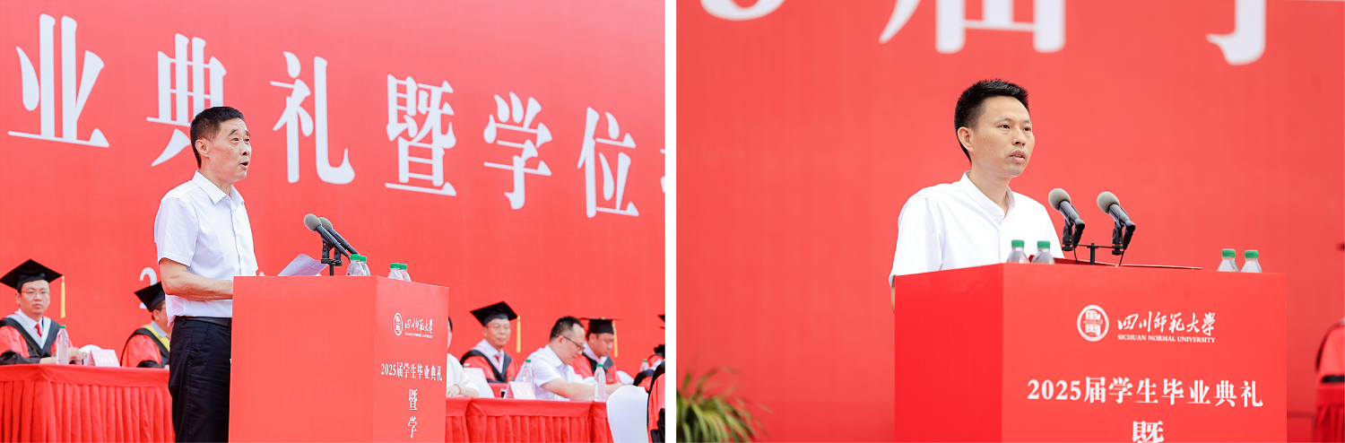 教育科学学院2004级硕士、2013级博士校友,成都市教育科学研究院党委副书记、副院长毛道生,物理与电子工程学院93级校友、成都石室东部新区实验学校党支部书记、校长谭崇宇作为校友代表发言。毛道生勉励毕业生们做有担当、有见识、有韧劲的奋斗者,成就最好的自己,擦亮四川师范大学品牌,献礼中国式现代化。谭崇宇巧妙运用“物理公式”阐述人生哲理,寄语大家走出属于自己的相对论人生。