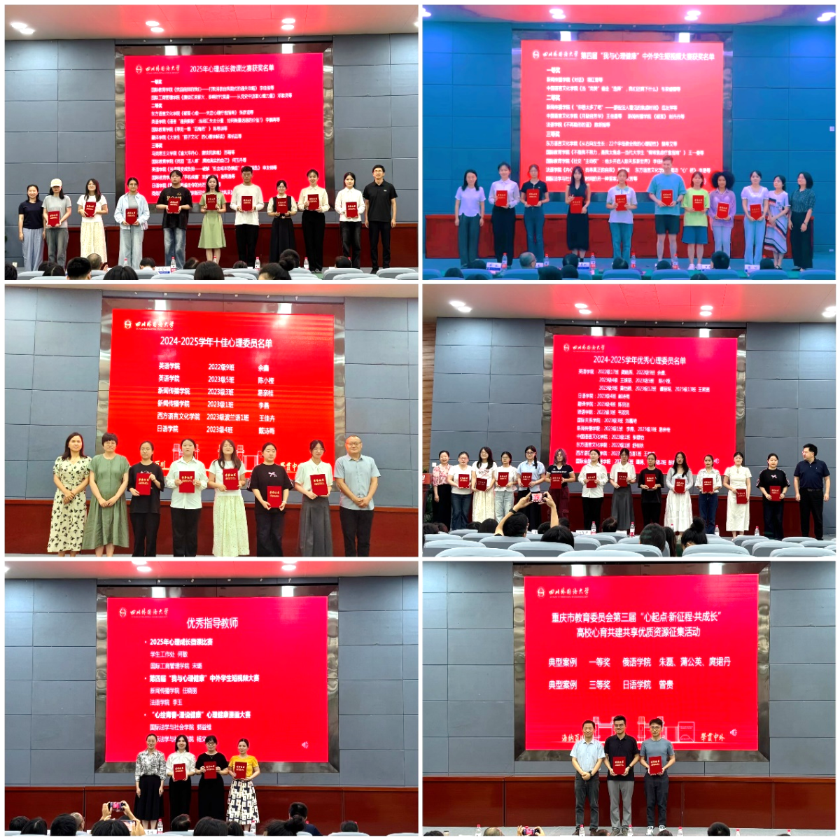 6月17日下午,由党委学生工作部主办的第二十一届“5·25”心理健康月颁奖典礼在歌乐楼A栋报告厅圆满举行。党委常委、副校长卢波出席本次活动。党委学工部部长常慧明,校团委副书记曹海燕,各学院党总支书记、副书记,心理健康辅导站站长、副站长,学院心理健康工作联络员、辅导员老师,获奖代表,心理委员以及大学生心理健康协会学生代表参加颁奖典礼。活动由学工部副处长何敏主持。
