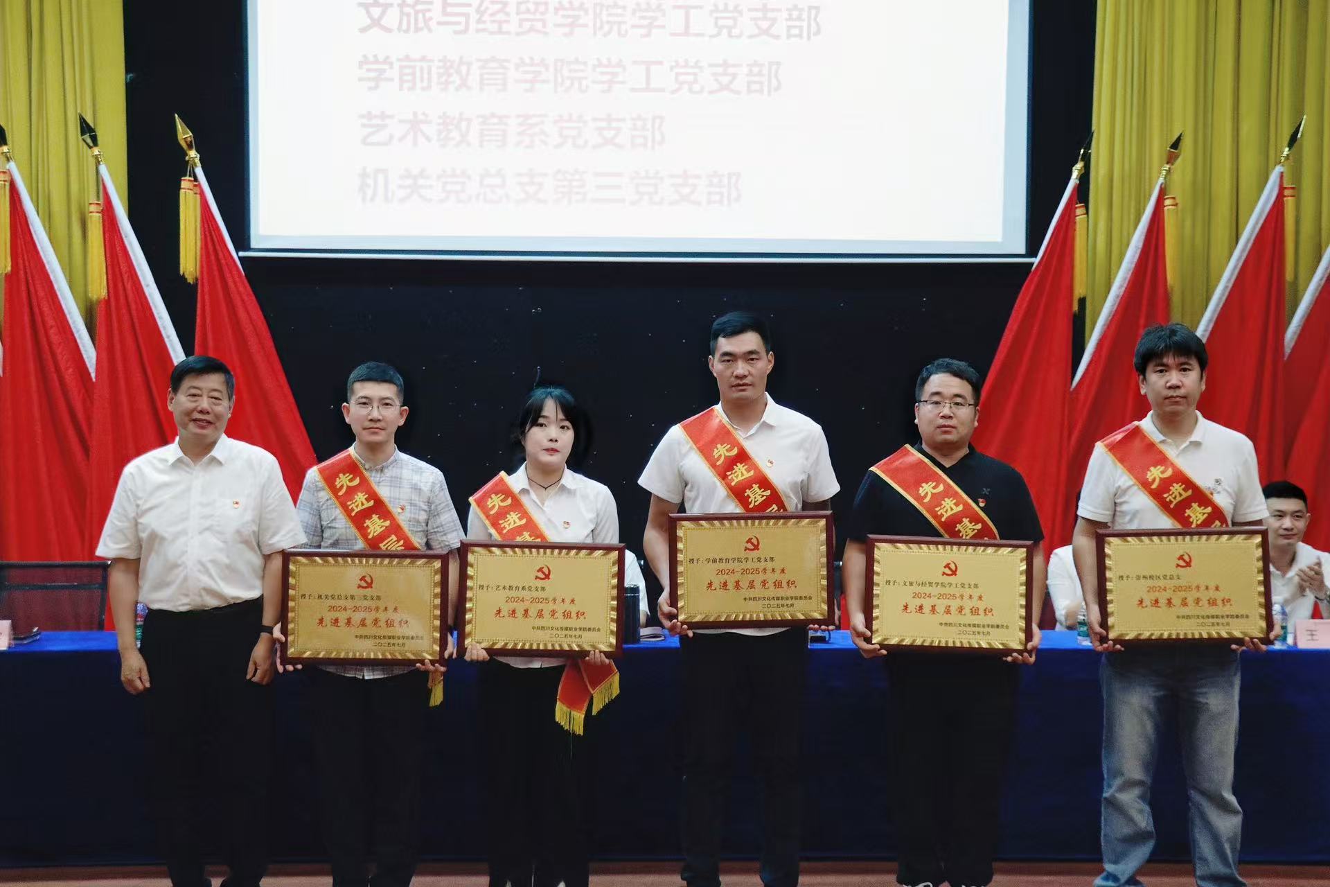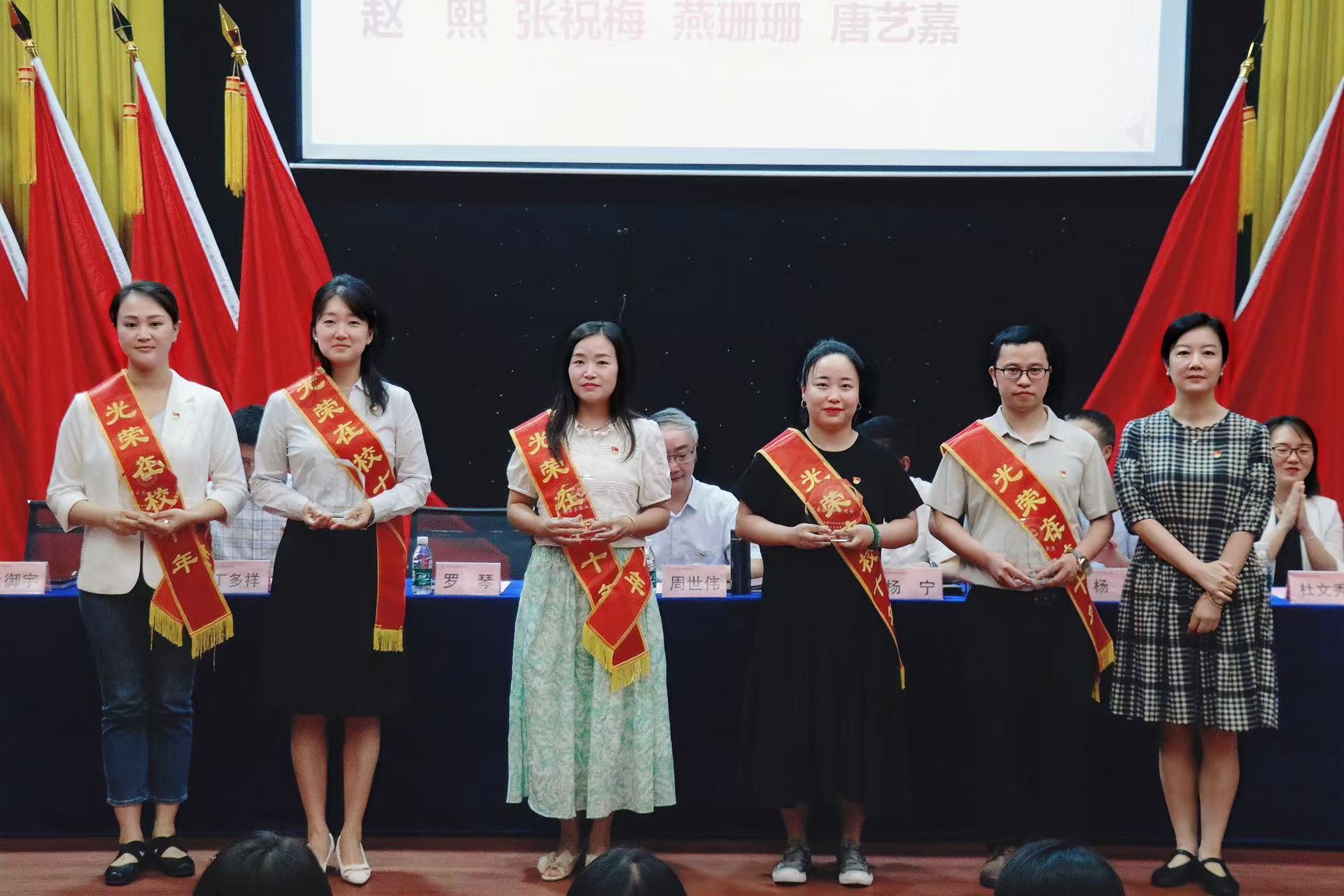 随后分别宣读了学校“七一”表彰决定、关于培育校级党建样板工作党支部及优秀支部工作法的决定,以及表彰“光荣在校10年”教职工的决定。主席台领导为获得表彰的30名优秀共产党员、12名优秀党务工作者、5个先进基层党组织颁奖,为1个党建工作样板党支部及1个优秀支部工作法培育项目授牌,为14名“光荣在校10年”教职工代表颁发了荣誉奖牌。表演与艺术教育学院艺术教育系党支部罗佳代表优秀个人作了表态发言。