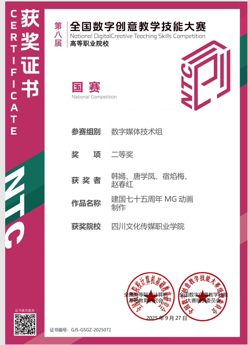 在刚刚落幕的第八届全国数字创意教学技能大赛全国总决赛中,四川文化传媒职业学院设计与媒体艺术学院韩嫣老师团队凭借作品《建国七十五周年MG动画制作》,从全国众多优秀参赛作品中脱颖而出,荣获国赛二等奖。这一成绩充分展现了学校在数字创意教学领域的扎实功底与创新活力,也是学校长期重视数字创新与教师发展的生动体现。