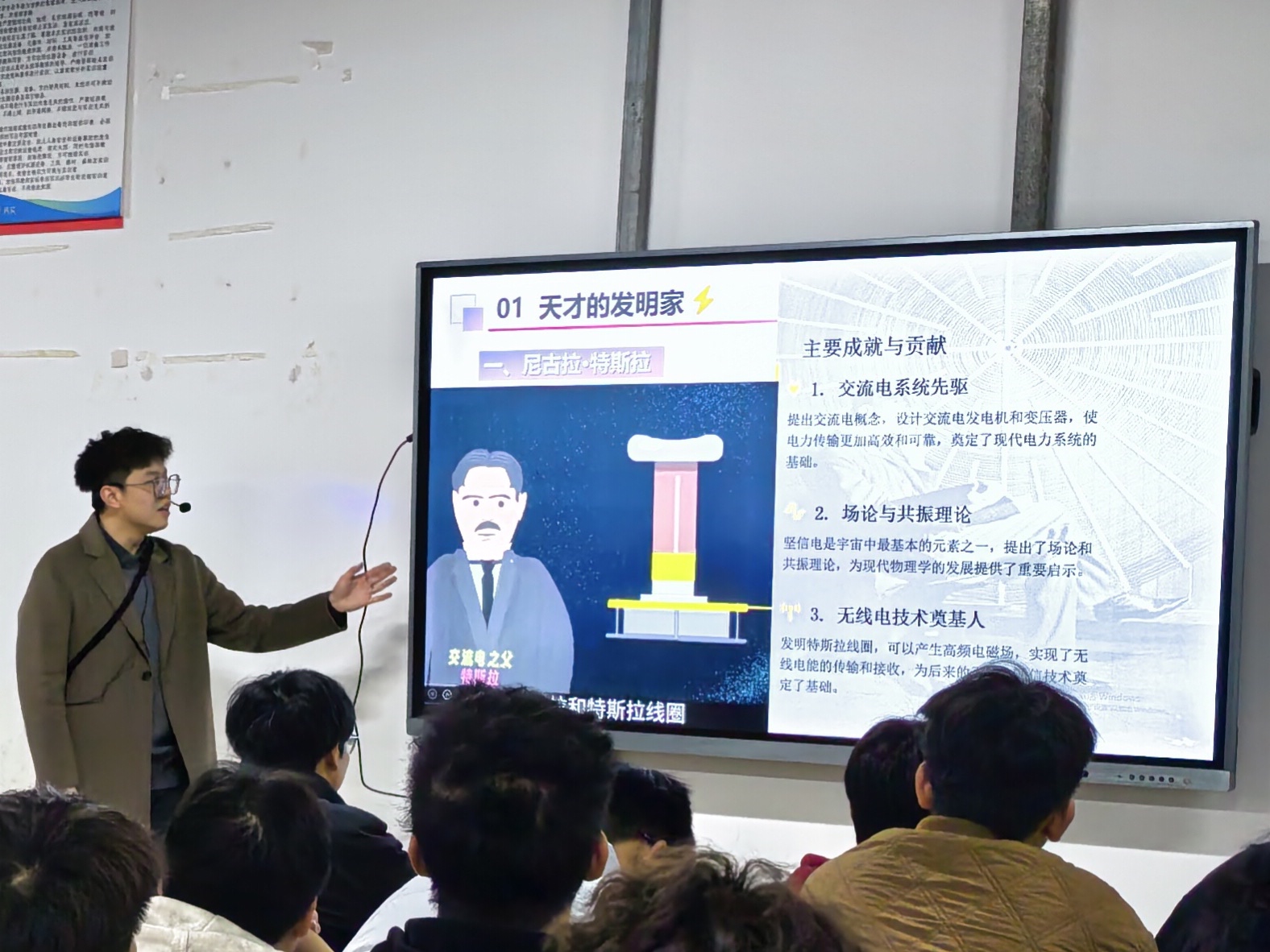 本章开篇没有直接讲“磁场”,而是向同学们展示特斯拉肖像卡片、发明成就图册,用3分钟讲“接地气”的科学家故事。