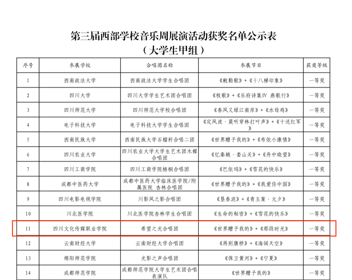近日,备受瞩目的第三届西部高校音乐周展演活动圆满落幕。本次赛事汇聚了四川、云南、贵州等地 45 所高校的优秀代表队,竞争异常激烈。四川文化传媒职业学院学子凭借扎实的专业功底、精湛的艺术表现力和默契的团队协作,在多个组别中脱颖而出,其中 “希望之光” 合唱团荣获大学生甲组一等奖,“百音”合唱团斩获大学生乙组(专业组)二等奖,创下高职院校在本次赛事中的最佳成绩,为学校赢得了荣誉。