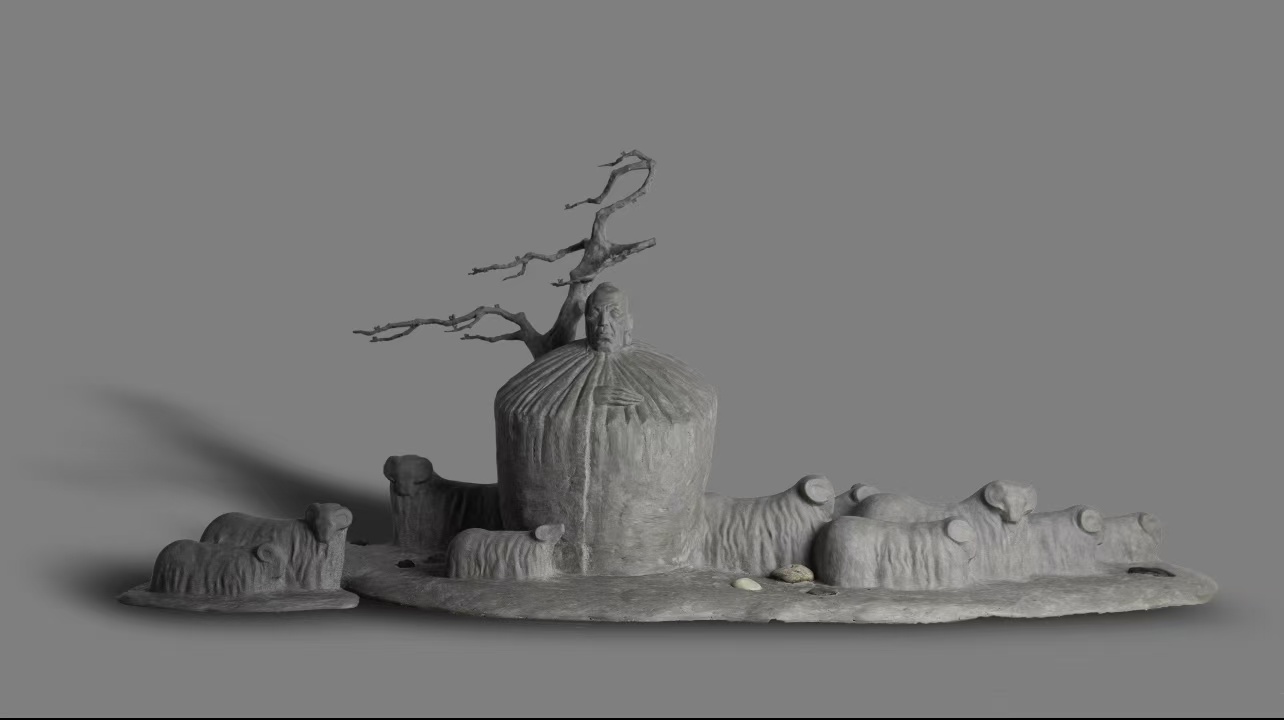 作品以彝族传统生活为蓝本,通过极具象征意味的视觉符号,构建出一幅充满张力的精神图景。中央人物被包裹在类似查尔瓦(彝族传统披风)的褶皱结构中,头部与枯树融为一体,既象征彝族人民与土地的深刻联结,也承载着民族的生存记忆与智慧。环绕的羊群形态各异,代表着游牧经济的物质根基,也寓意着家族的繁衍与生活的希望。背景中遒劲的枯树枝干,隐喻着民族在严酷环境中坚韧不拔的精神内核。整件作品不仅是对彝族传统生活的艺术再现,更提醒我们:那些根植于土地的文化记忆,依然是这个时代最宝贵的精神财富。